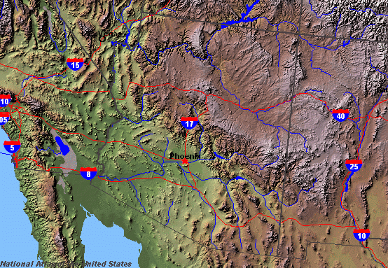 These maps use shading to give the impression of elevation. For example, the entire NE part of AZ is the Colorado Plateau at 5000-7000 feet above sea level. Phoenix is at an elevation of ~1100′. These are excellent examples of terranes; The Colorado Plateau and the Basin and Range–PHX is in a basin but it is surrounded by small ranges, like Phx Mtns, South Mtn, White Tank Mtns, etc).