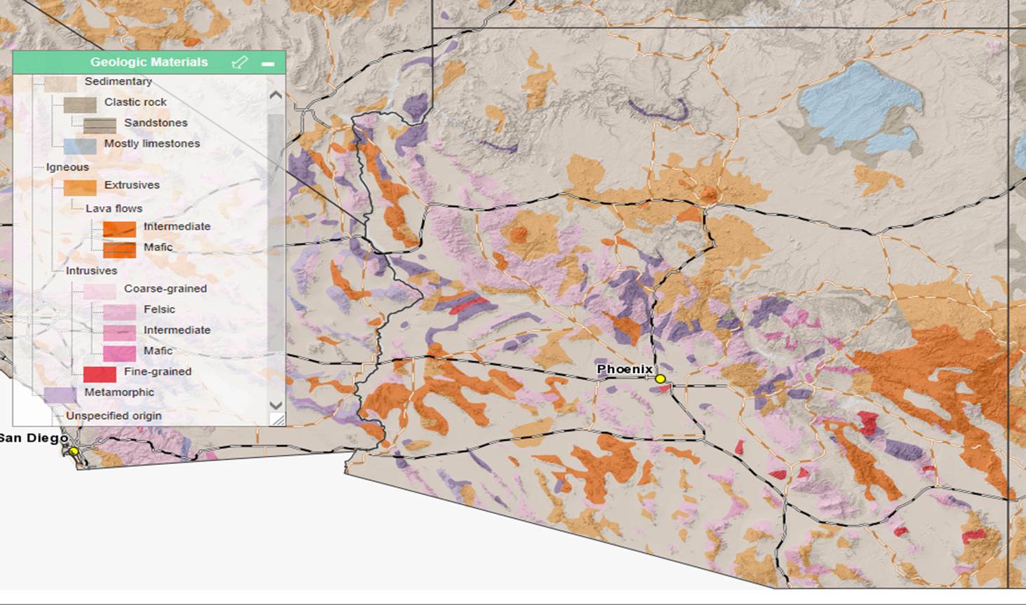 This map shows relief with shading as well as the rock types. It shows that the CO Plateau is fairly uniform sedimentary rocks whereas the Basin and Range terrane includes small patches of darker colored metamorphic (purple) and igneous (red/brown) rocks associated with local high relief in the small mountain ranges. These are surrounded by sediment that eroded from these mountains. I am not going to get into these specific rocks types on this page because excellent layman descriptions can be found in Roadside Geology of Arizona by Halka Chronic (Mtn. Press Publishing, Missoula, Montana), and