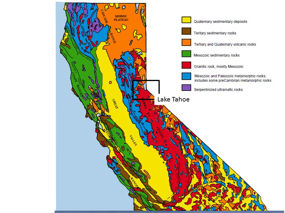 The small rectangle is the approximate location of the famous Rubicon Run from Morristown to L. Tahoe, California. I made this run with some fellow offroaders in 1983. The granites are shown in red, which is a lot bigger than the Harney Granite pluton. It isn’t much higher, however, with peaks at ~8700 feet. These intrusive rocks are also much younger, being intruded over millions of years during the Mesozoic period (~88-210 million).