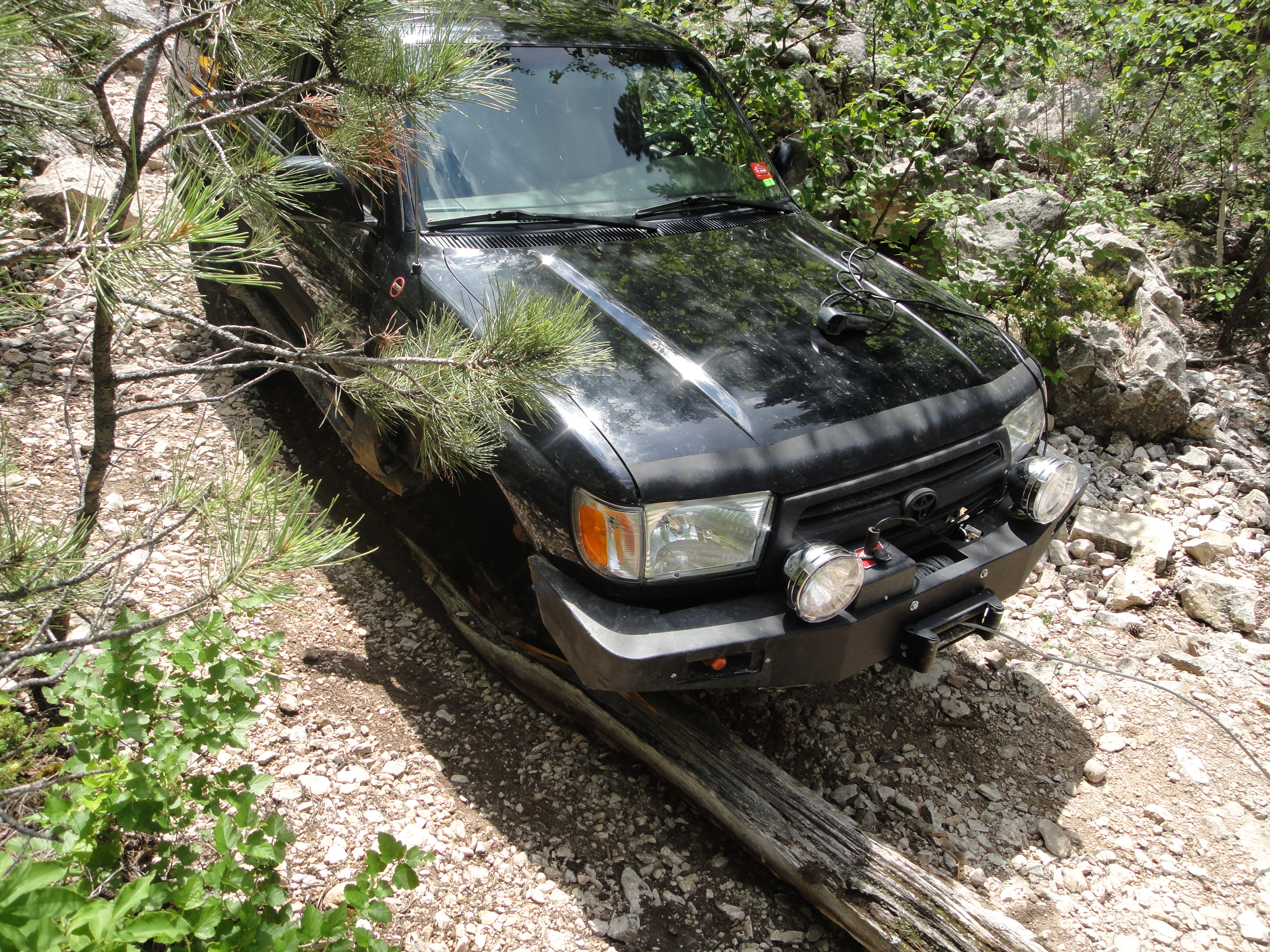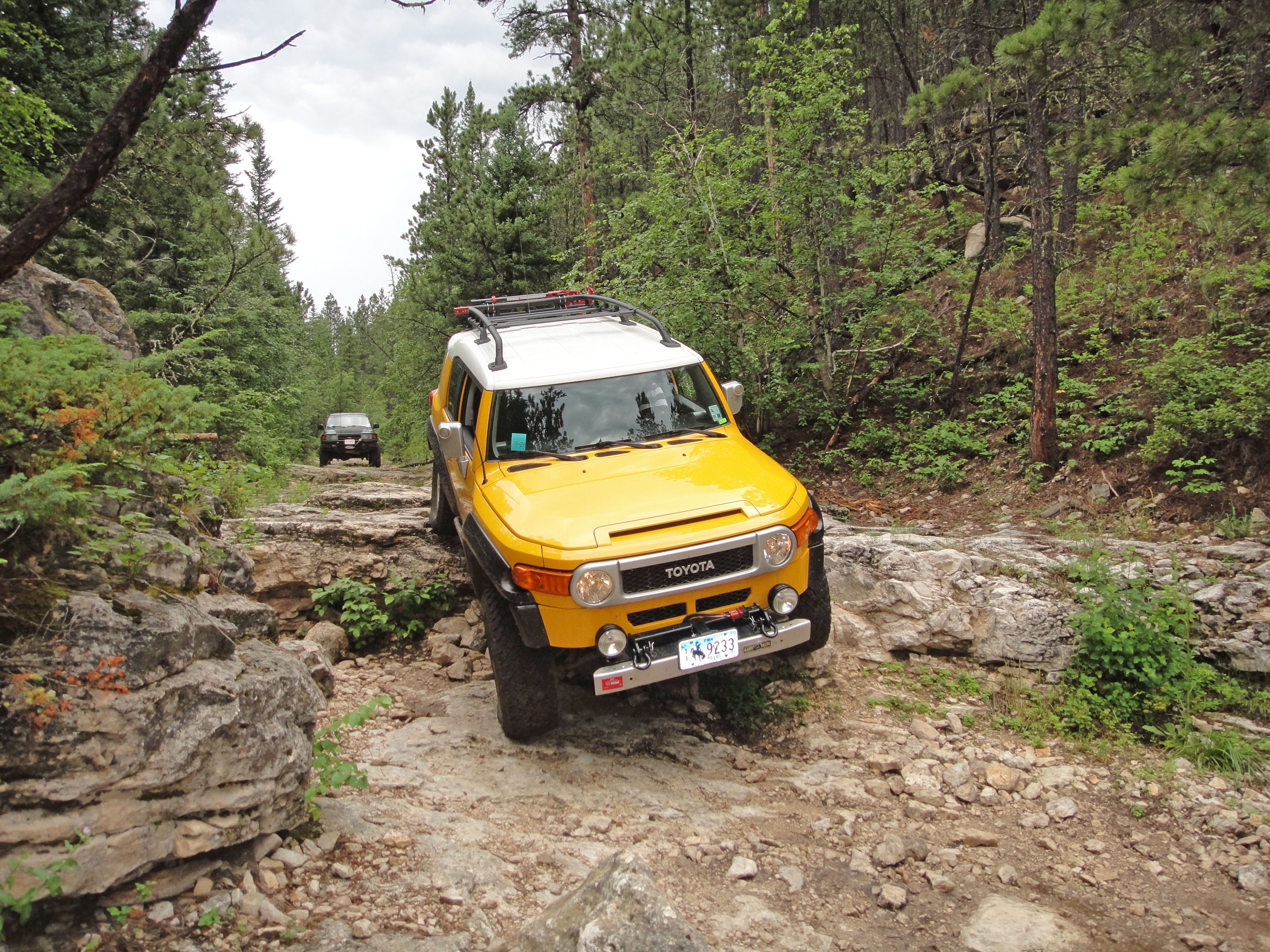 One final word; only damaged the muffler some more and learned how to drive the automatic transmission over rocks while using the sliders to wedge the FJ through narrow openings.