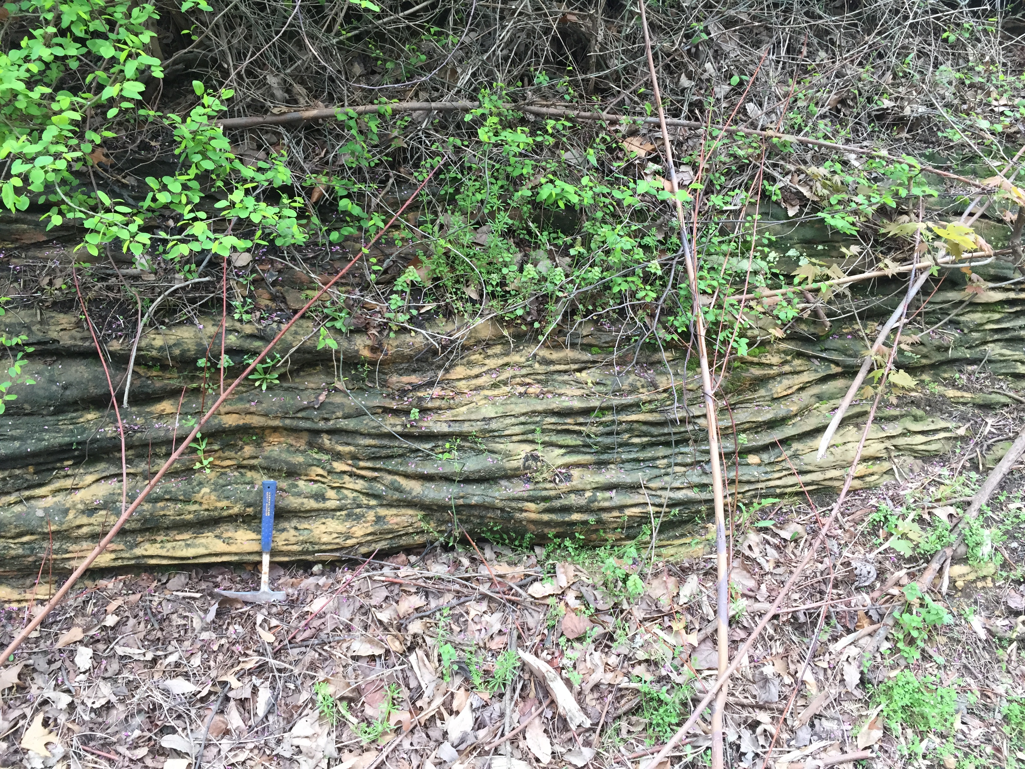 What I did see was dark soil that had eroded from the shale layers within the Mpm (Mississippian Pride Mountain Formation) and sandy layers with both massive and fine layering with cross-bedding. Here are some good images of these features.