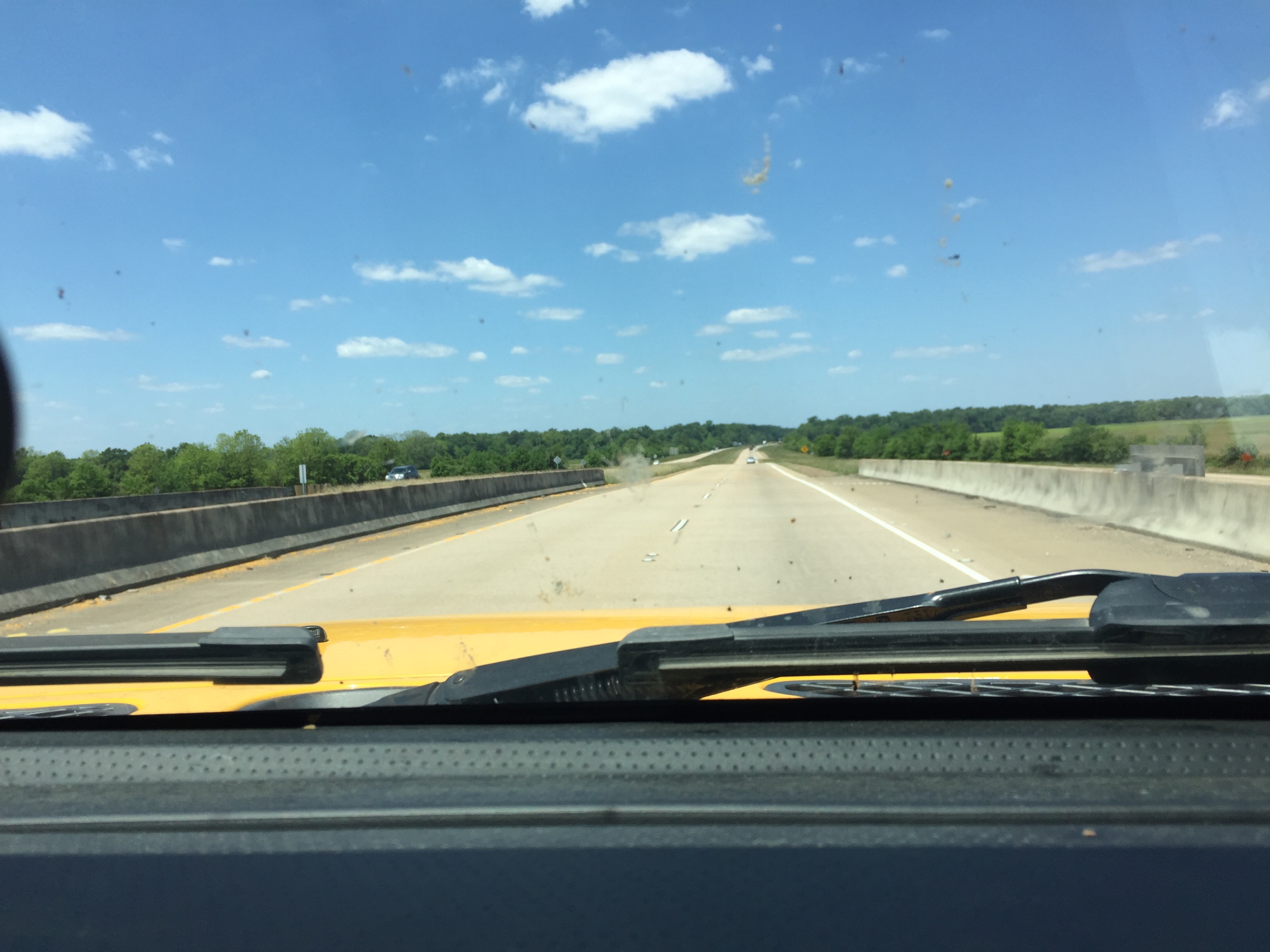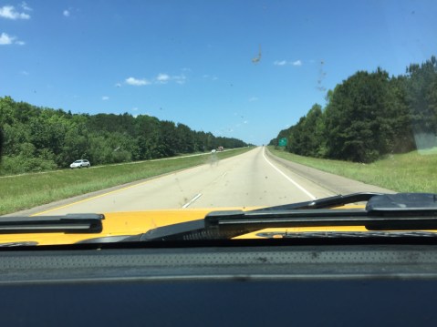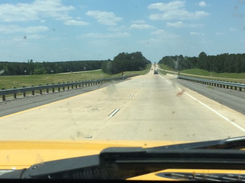 The dash line is my path. As I drove north, the pink Qal was flat with farms but where I crossed exposures of the Pleistocene terraces (aka Pt), linear ridges were present as seen in previous post. As I crossed into the Miocene sedimentary rocks (light purple), the terrain became hilly until Shreveport (westward turn near top of path). However there was much more variability than the map suggests. Here is photo of hilly Miocene