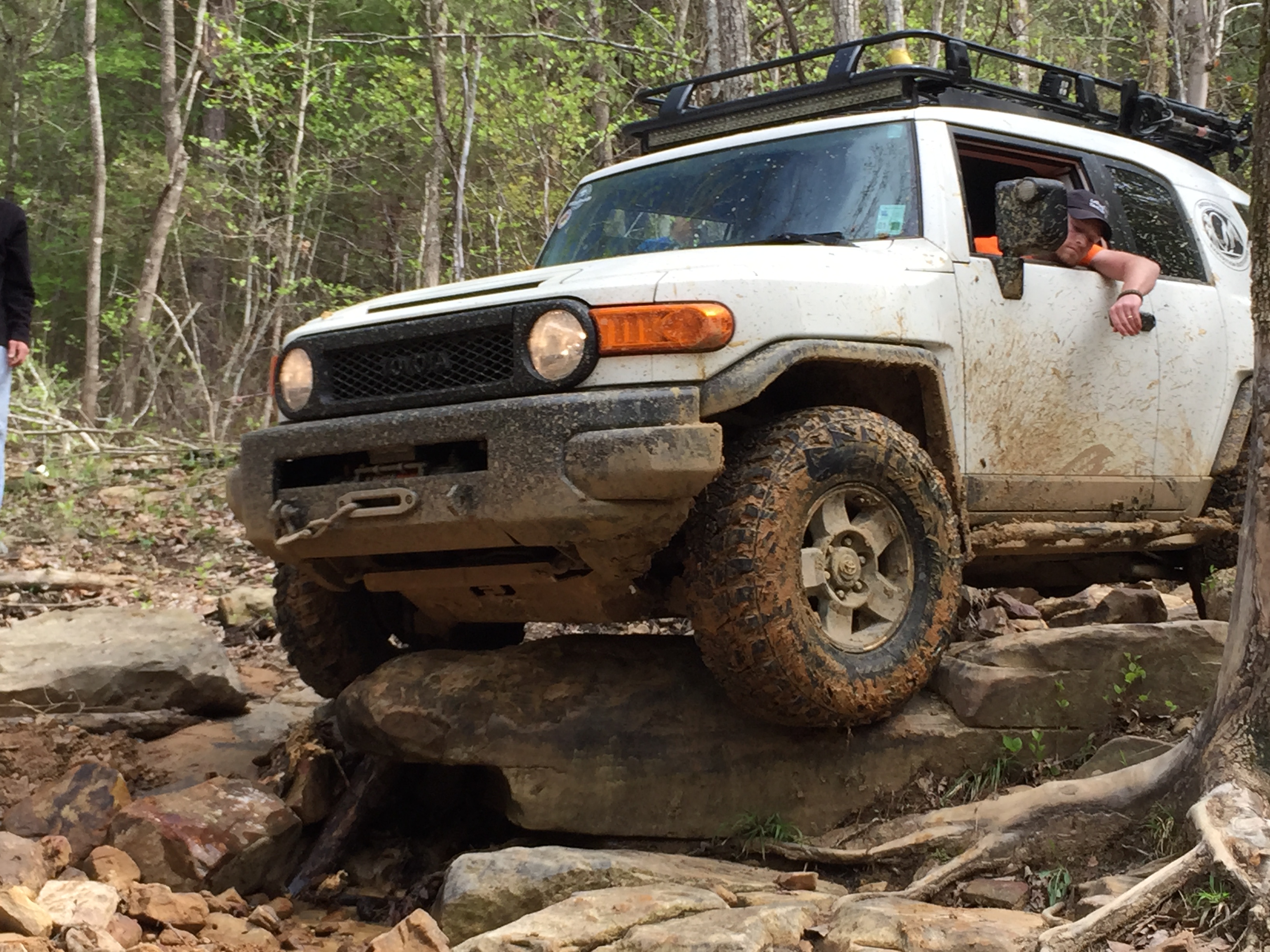 This post attempts to relate the previous comments to the four-wheeling experience in northern AL. First, I am going to show some photos of trucks meeting these rocks up close. This photo says a lot about HPORV park…my truck is parked on a flat, muddy, area with 3-6 foot ledges to the right side.