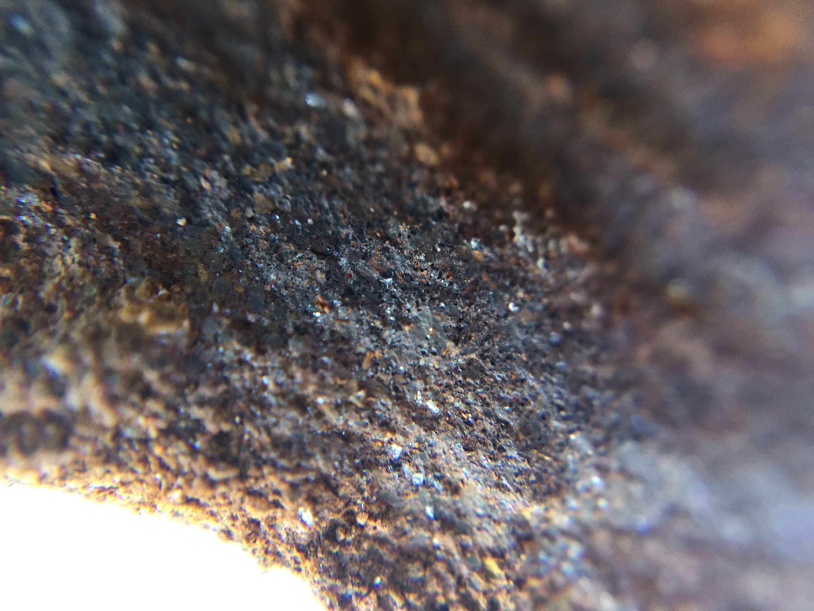 The next major issue I discerned from my samples and trip was the red mud, which is the result of oxidation of iron (Fe) with lots of oxygen. The samples were both dark grey inside, which indicates no iron oxidation The red color seen in concentric zones in my samples, and the entire mountain, was from exposure of these sandy shales to the atmosphere as they erode and fracture. This photo with the 15x lens shows the amount of void space (i.e. porosity) in these rocks.