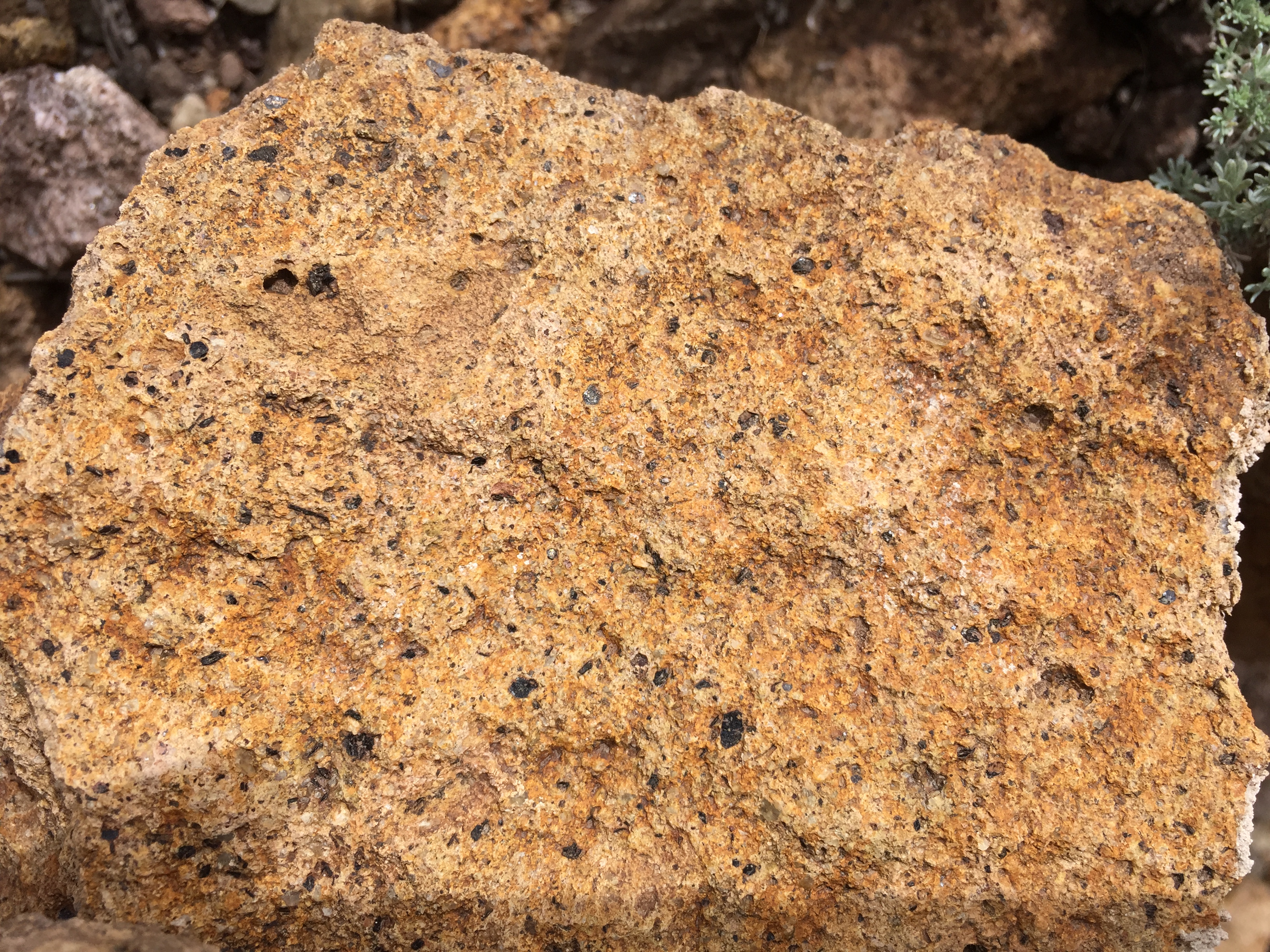 A close-up view of one of the larger fragments shows that this rock can be classified as an andesite porphyry.