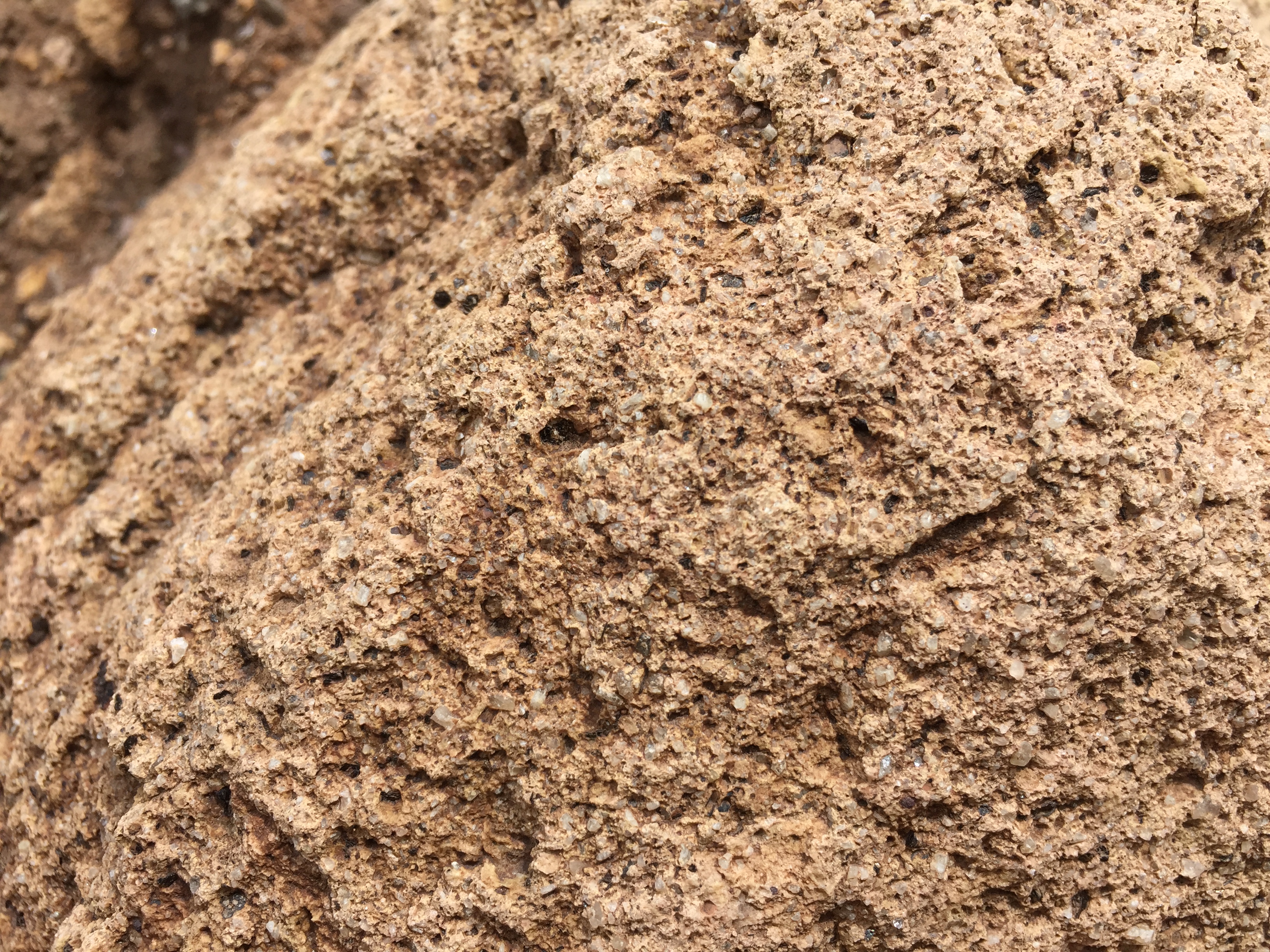It has the coloration of the orthoclase (K-Feldspar) we saw in the granitic rocks from previous posts but it also has many holes (vesicles), which originally contained gas that later escaped; some of these holes are left from weathered minerals and rock fragments that were entrained during eruption. I suggest using your browser to zoom in on this image to see the remarkable number of different particles it contains, many of which are probably from the sedimentary rock through which it passed during extrusion. Here is another sample that has a different weathering color but is essentially the same.