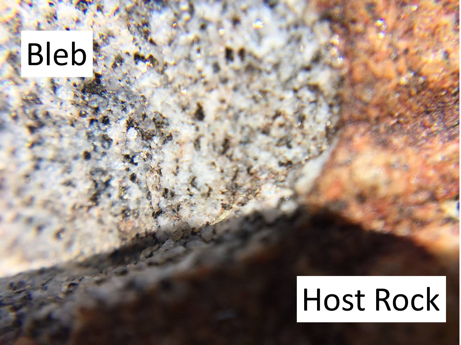 This photo at 15x magnification shows a bleb (tiny inclusion…this one < 1 cm in diameter) of light-colored minerals in the host rock, which appears orange in this photo, despite looking gray to the naked eye (see the outcrop photo above). The minerals in the bleb look like "salt and pepper", which has no specific meaning but it suggests that the host rock produced these inclusions when heated as the Tertiary granitic melt (liquid rock before crystallizing) invaded. The gray quartz is easily identified (no longer rosy looking due to heat and pressure) and the white could be albite? but the dark minerals would require microscopic examination to identify.