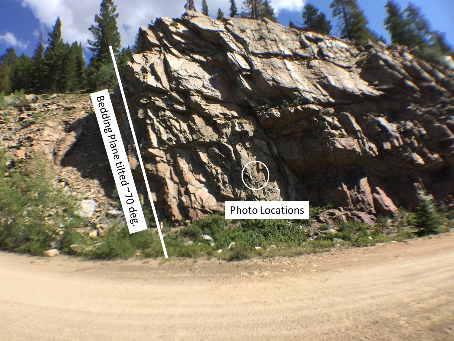 This photo shows the orientation of the original bedding plane (horizontal surface of the sediments that became the rock before it was metamorphosed and intruded) of the silts and clays that were originally deposited during the Tertiary period (~65 – 2.5 mya). The tilting occurred during the Laramide Orogeny that created the Rocky Mts. The circle shows where the following photos were taken.