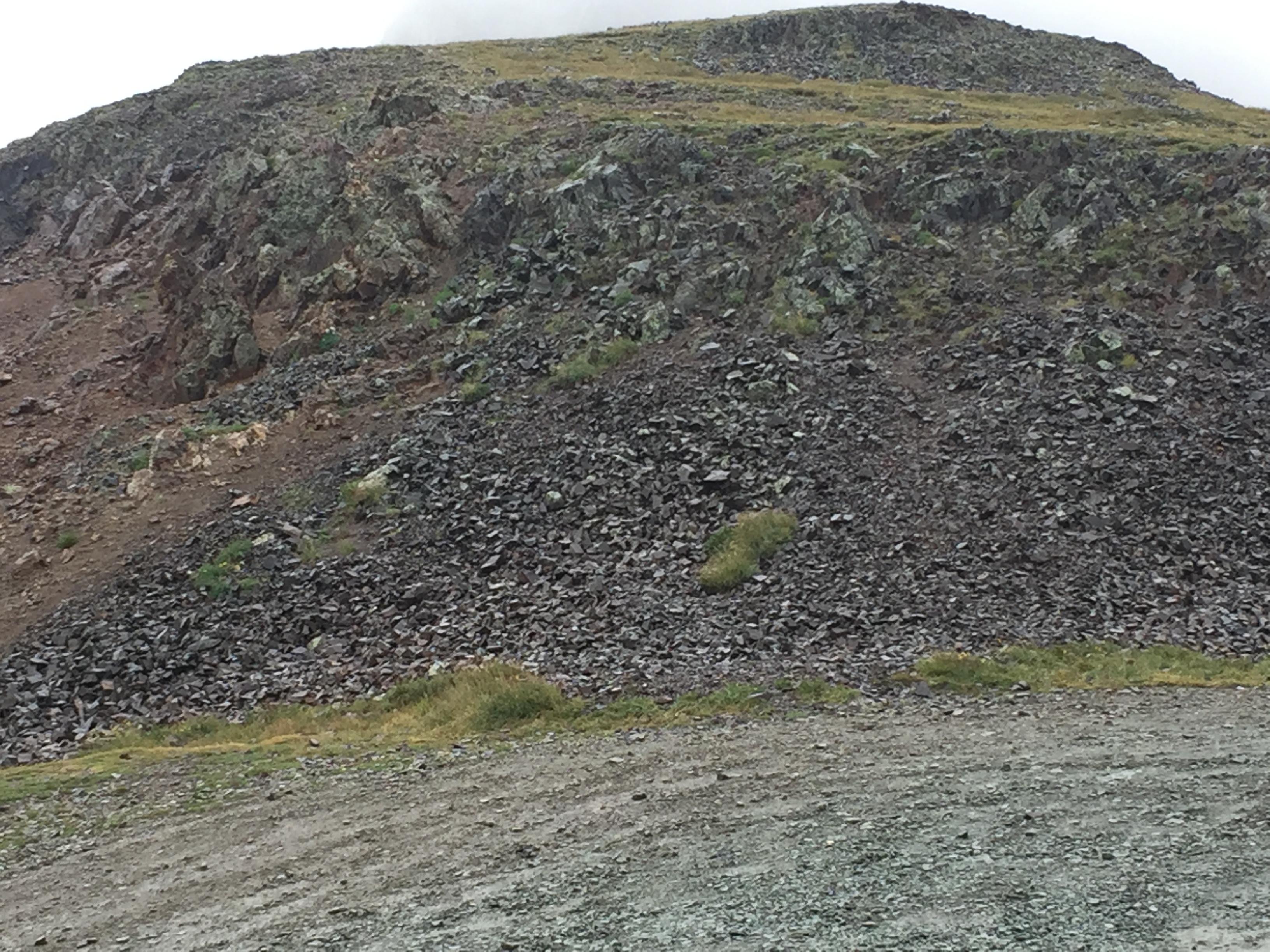 It would appear, however, that none of these veins west of Animas Forks contained economic concentrations of gold and silver. We made our final descent to Silverton via the potentially deadly Corkscrew Gulch trail in the rain, which is why I have no photos of the trail or the rocks. As we approached US-550, the hills were dominated by light-colored talus that did not originate from mines, but from weathering of the volcanic rocks. This could be another example of dense fracture patterns associated with faulting after the original ash flows were deposited.