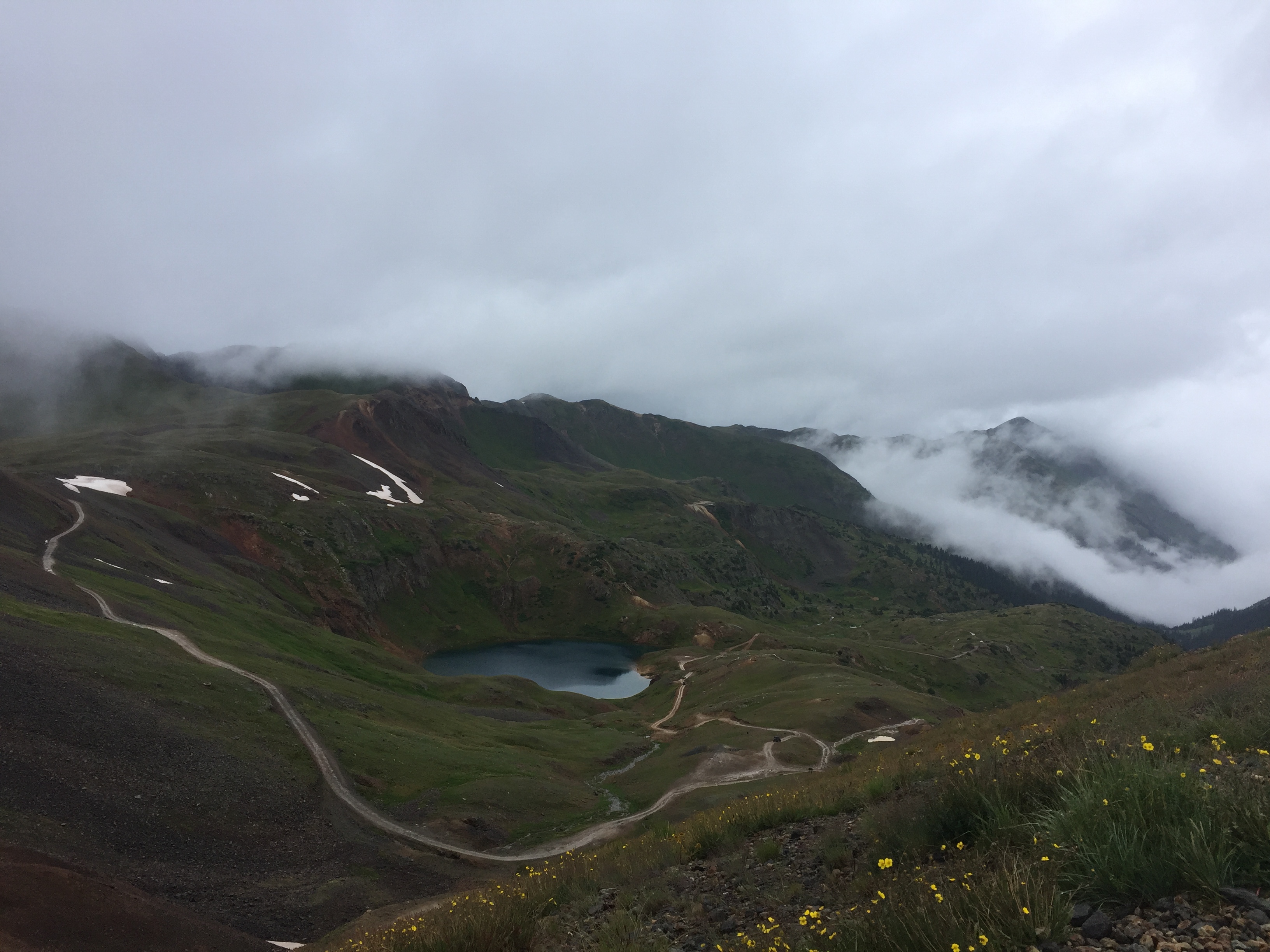 The headwaters of the Gunnison River ended in a shallow, flat meadow that appears to be another cirque (glacier origin area) from the recent ice ages. After crossing Cinnamon Pass, where the horizontal rain and fog/clouds made for miserable conditions, we dropped down into Animas Forks, which must have been a bustling mining community at one time. Today, however, it is represented by a few old mines (some for sale) and a USFS toilet.