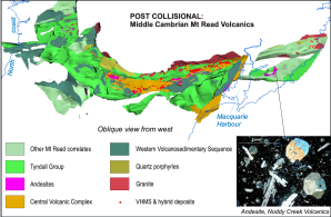 Day 2 will take us across the heart of Tasmania (See Fig. 1a), beginning with metamorphosed Cambrian volcanic and sedimentary rocks, coinciding with the Tyennan Orogeny. These rocks were deposited in the Dundas Trough (Fig. 3) and intruded by a granitic batholith as mountain building progressed.