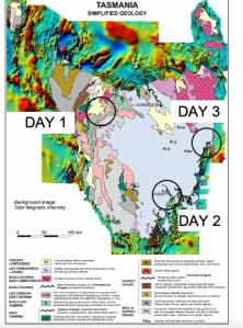 Day 1 will be spent going from Proterozoic (~1.2 BY) in the NW, to Cambrian (~600-500 MY) at the first stop. This is going to cover a lot of geology, including a major mountain building episode in the Cambrian. We will spend the night at Cradle Mountain, in the middle of Dundas Trough (Fig. 2).