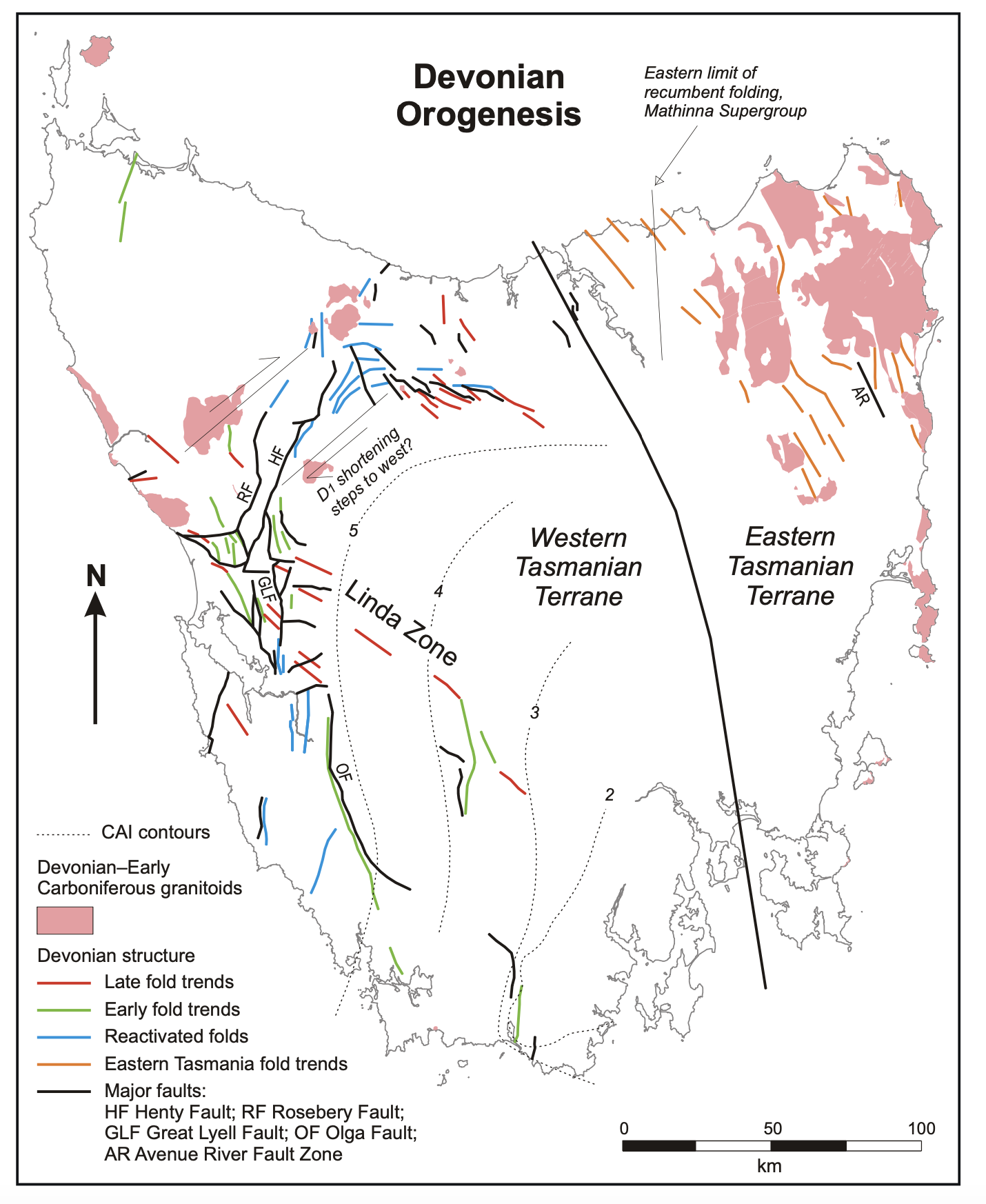 Day 2 will take us across the heart of Tasmania (See Fig. 1a), beginning with metamorphosed Cambrian volcanic and sedimentary rocks, coinciding with the Tyennan Orogeny. These rocks were deposited in the Dundas Trough (Fig. 3) and intruded by a granitic batholith as mountain building progressed.