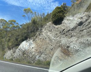 The second day of our field excursion covered quite a bit of the geological history of Tasmania, so we’re going to continue discussing this very long day (from Cradle Mountain to Hobart) in this post. To summarize, we saw exposures of Proterozoic (1600-540 MY) and Cambrian (509-485 MY) sedimentary and volcanic rocks between the coast and Cradle Mountain (see Fig. 1 for final location). These were metamorphosed and indicative of hydrothermal activity in the region, as discussed in a previous post.