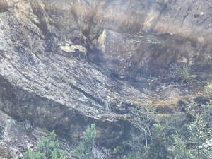 Figure 7B has original bedding highlighted. This shows a tight fold on its side (recumbent) and juxtaposed against vertical bedding. There are certainly some faults present between these layers. The rocks were brittle enough (i.e. shallow burial) to break and slide against one another. Zooming in closer on the “C” in Fig. 7C, we see that there was no remineralization in these tightly folded rocks (Fig. 8).