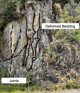 Figure 5B has been annotated to better show some features of deformation without strong remineralization. The irregular lines showing deformed bedding are more-or-less original variations in particle size and/composition (i.e., sedimentary layering) that has been squeezed and had the grain size of crystals increase in response to heat and pressure. The joint pattern has nothing to do with this but came later, as the rocks cracked from cooling and reduced pressure (similar to mud cracks).