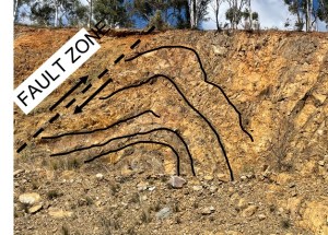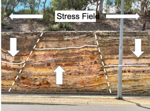 The white, horizontal line indicates what I think was originally a continuous sediment layer, so there’s about 3 feet of displacement along the normal faults indicated by dashed lines. The block arrows show relative direction of movement of the three blocks seen in the photo. The stress field is tensional, i.e., the sediments/rocks were being pulled from both ends, somewhere other than this outcrop. Note the upward curvature of the sub-horizontal line on the left side of the image. This sediment was not cemented when faulting occurred.