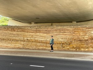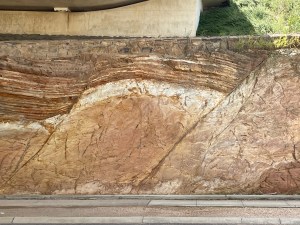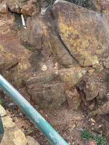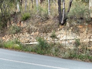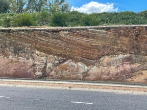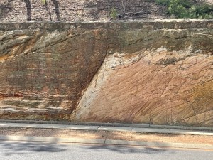 We had the opportunity to take a few photos of a spectacular road cut of the Canberra formation (also 443-427 Ma) located on the eastern edge of Fig. 5. This formation consists of finer clastic sediments and some volcaniclastics. We couldn’t stop for a close examination because of heavy weekend traffic and no place to pullover, so we drove slowly where there was a passing lane and took a lot of photos. Figure 9 is representative of what we saw (after the fact).