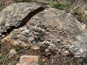 The fanglomerates exposed by the excavation haven’t been dated but are believed to be 2-3 million years old. This is too old for carbon-14 and too young for other radiometric techniques. Apparently, they don’t contain sufficient fossils to date either. These rounded cobbles of all sizes (Fig. 2) were deposited on an alluvial fan (hence the name) near steep mountains.
