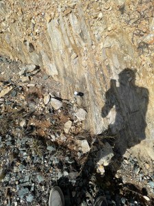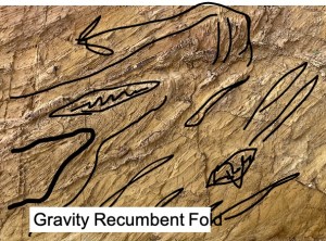 These were two identifiable (to me) folds with thrust faults. The area labeled “Fault Zone” had no recognizable bedding and tended to be fragmented. Other photos revealed vertical to overturned beds or breccia zones with no discernible structure.