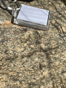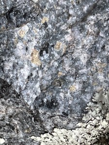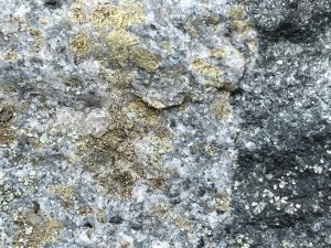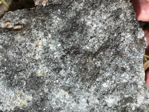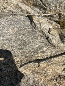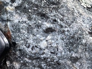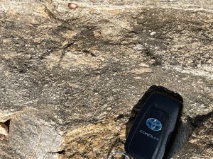 Figure 8A shows the largest outcrop we found. It is about 4 feet across. A closer look reveals a granitic texture, with alkali feldspar and quartz visible as the pink-to-white and gray crystals, respectively (Fig. 8B). An even closer look (Fig. 8C) verifies the overall impression we have from panel B. However, this is not a homogeneous granite as seen in panel D, which shows contamination by lithic fragments (angular grains) and evidence of strain (shear displacement) as the magma was cooling, producing weak lamination within the darker part of Fig. 8D.