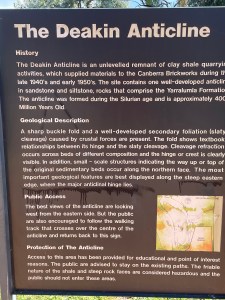 10 – Deakin Anticline: A well developed anticline, with a fault between two rock outcrops in volcanoclastic fine sandstone and siltstone of the Yarralumla Formation (424-423 Ma).