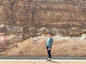 Figure 10A gives more technical details than I can give, and it is a good example of how seriously Australian’s take geology. Anything accessible has a sign explaining its geological history. Panel B shows the anticline hinge that made the site famous. Figure 10C shows the fine lamination expected in a fine-sandstone, with indications of soft-sediment deformation as well (near the key fob). Panel D shows what’s left of the hinge point. Looking back at Fig. 10B, the hinge (greatest curvature) is to the left of Yoko. That’s what is shown in panel D. In other words, this anticline was folding over like so many others (e.g., Fig 9) when the rocks were deeply buried and being compressed. I walked all around the site but found no glaring evidence of the fault referred to in Fig. 10A.
