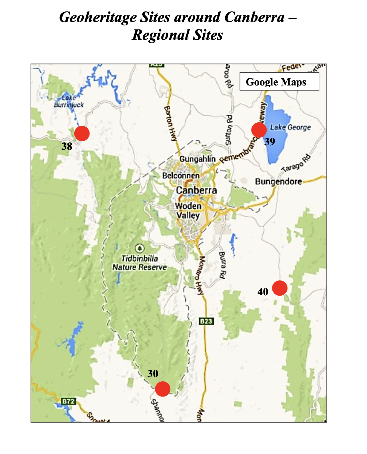 39 – Lake George: Late Ordovician (485-443 Ma) quartz turbidite and black slate (Adaminaby Group). Silurian (~420 Ma) turbidites, volcanics, and granite.