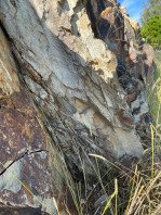 Figure 5 shows small outcrops (< 2 feet in length) of in-place fine-grained rock with large quartz crystals along joint surfaces (Fig. 5A) and as veins within joints (Fig. 5B and C). This fine-grained rock is part of a granitic pluton about 420 Ma in age, towards the end of the orogeny. The fine-grained rock may be overlaying volcanics into which the granitic rock was intruded at this location, although no intrusive rock was visible.