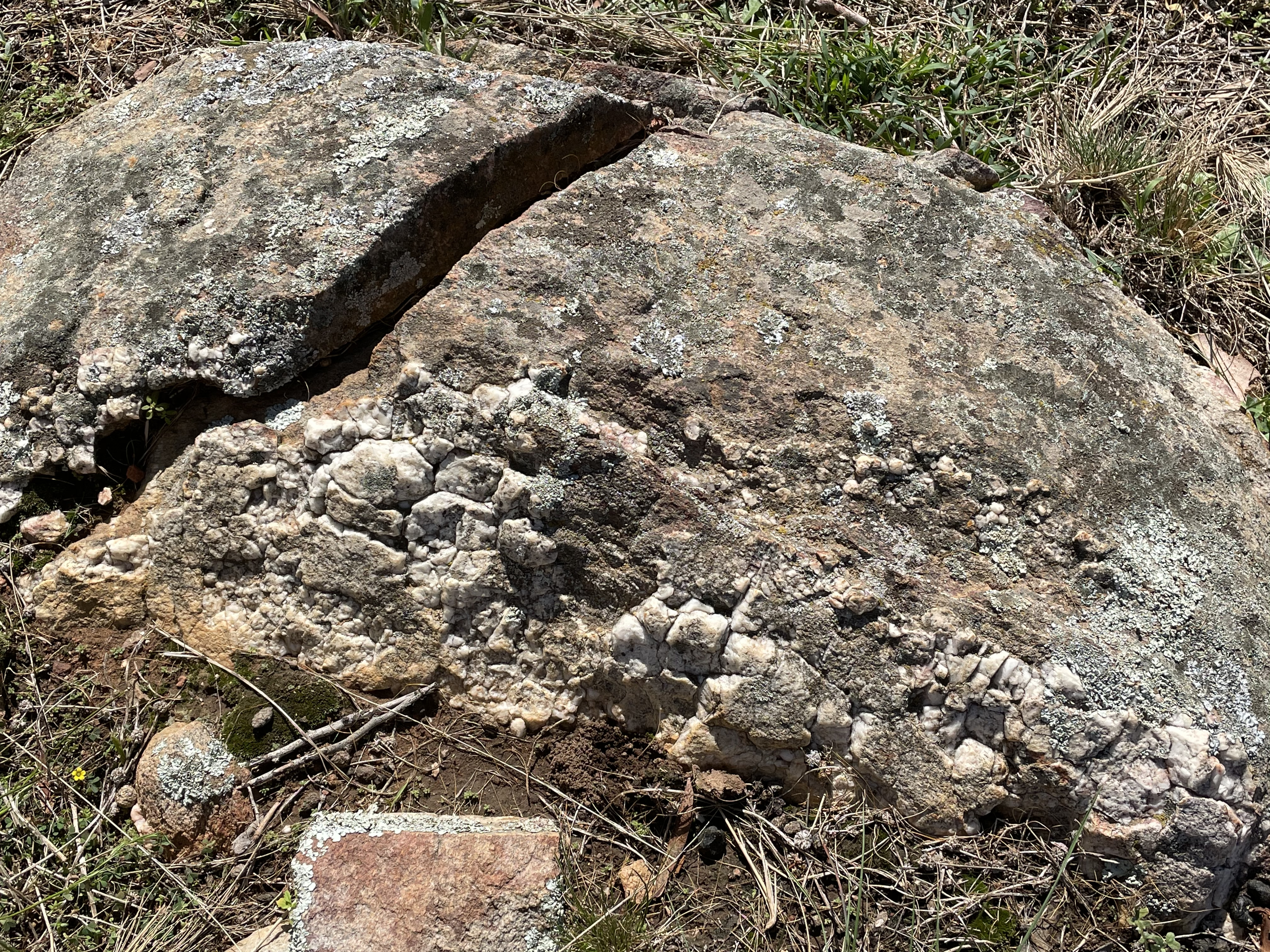 Figure 8A shows the largest outcrop we found. It is about 4 feet across. A closer look reveals a granitic texture, with alkali feldspar and quartz visible as the pink-to-white and gray crystals, respectively (Fig. 8B). An even closer look (Fig. 8C) verifies the overall impression we have from panel B. However, this is not a homogeneous granite as seen in panel D, which shows contamination by lithic fragments (angular grains) and evidence of strain (shear displacement) as the magma was cooling, producing weak lamination within the darker part of Fig. 8D.