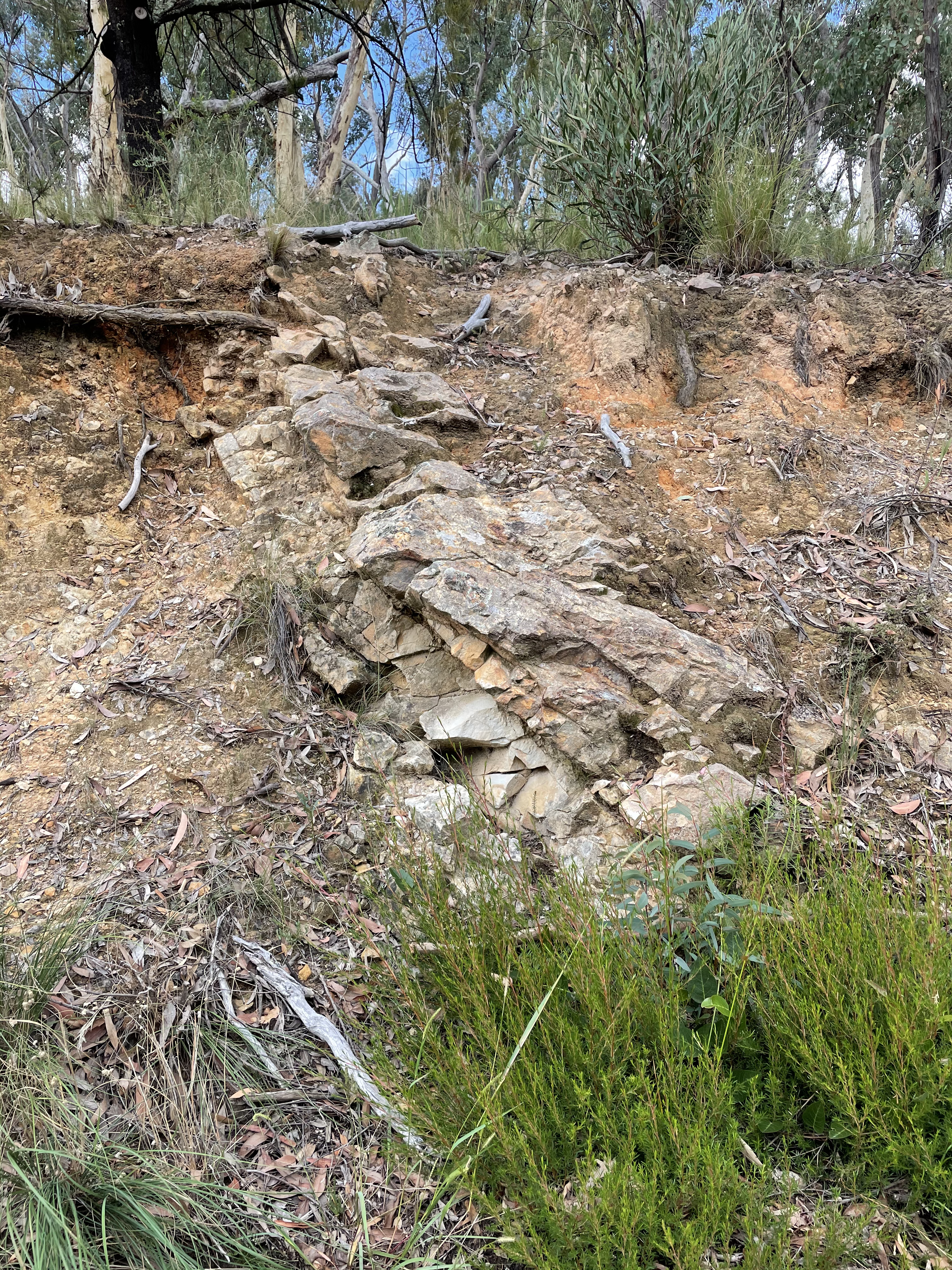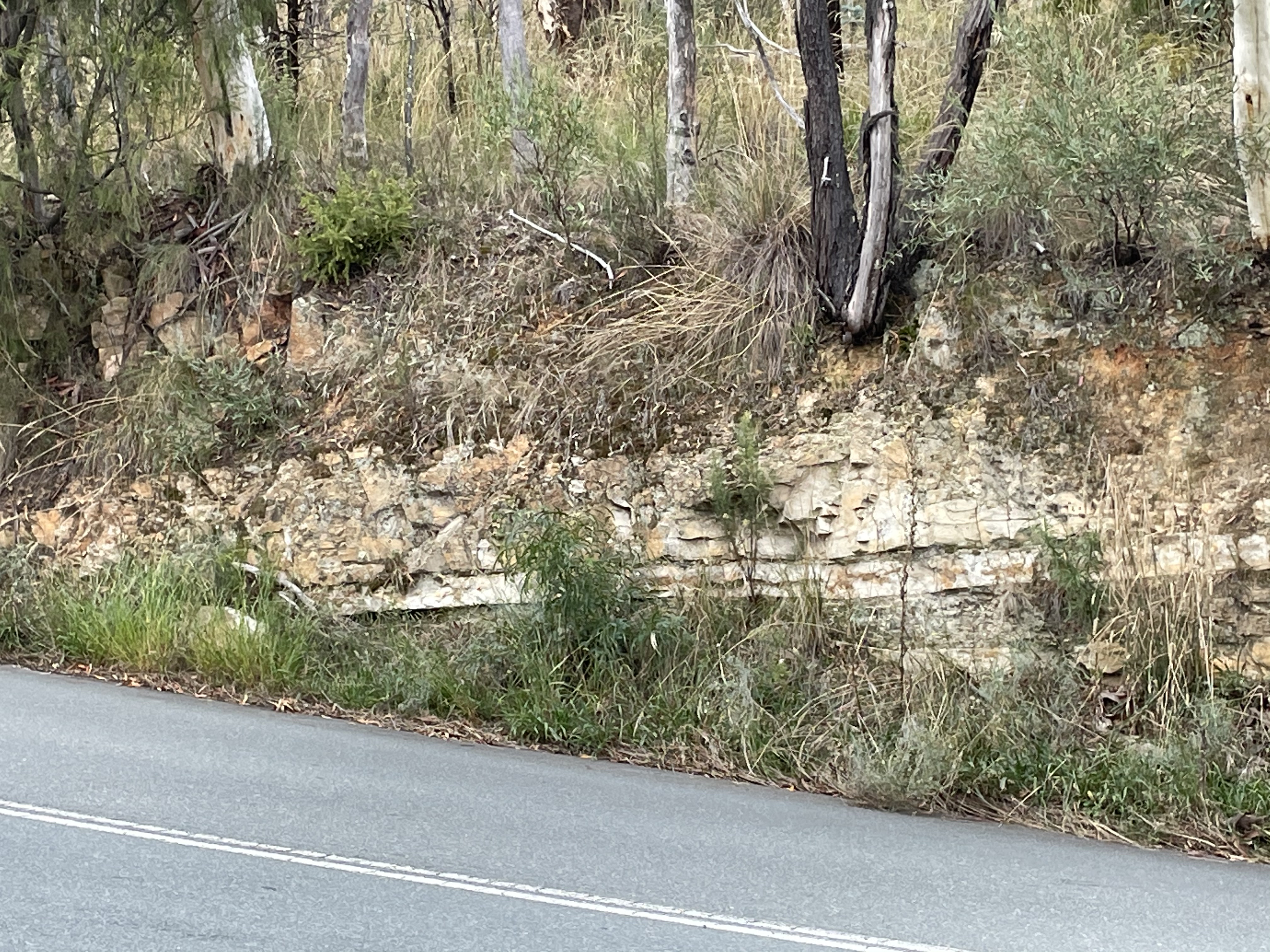 We had the opportunity to take a few photos of a spectacular road cut of the Canberra formation (also 443-427 Ma) located on the eastern edge of Fig. 5. This formation consists of finer clastic sediments and some volcaniclastics. We couldn’t stop for a close examination because of heavy weekend traffic and no place to pullover, so we drove slowly where there was a passing lane and took a lot of photos. Figure 9 is representative of what we saw (after the fact).