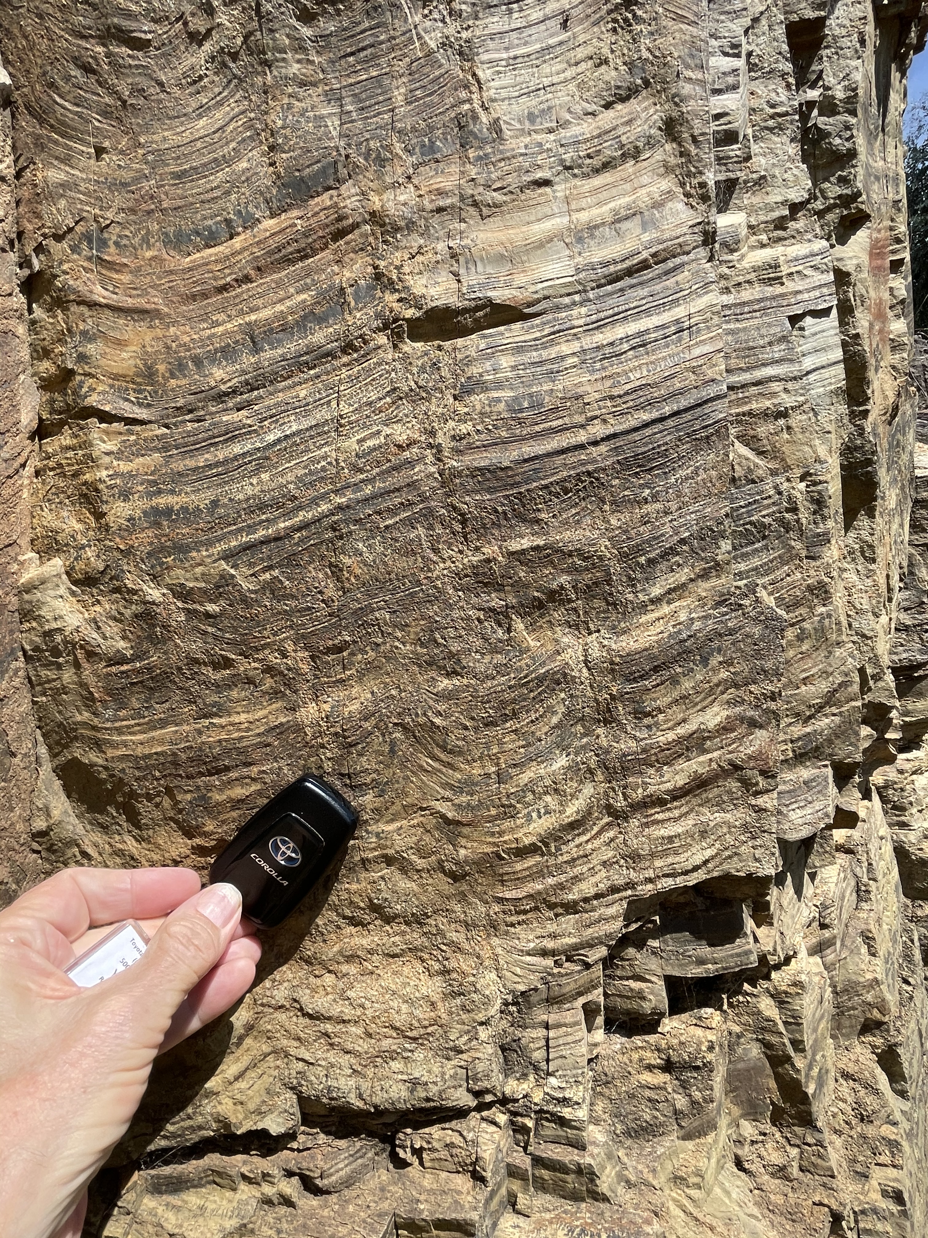 Figure 10A gives more technical details than I can give, and it is a good example of how seriously Australian’s take geology. Anything accessible has a sign explaining its geological history. Panel B shows the anticline hinge that made the site famous. Figure 10C shows the fine lamination expected in a fine-sandstone, with indications of soft-sediment deformation as well (near the key fob). Panel D shows what’s left of the hinge point. Looking back at Fig. 10B, the hinge (greatest curvature) is to the left of Yoko. That’s what is shown in panel D. In other words, this anticline was folding over like so many others (e.g., Fig 9) when the rocks were deeply buried and being compressed. I walked all around the site but found no glaring evidence of the fault referred to in Fig. 10A.