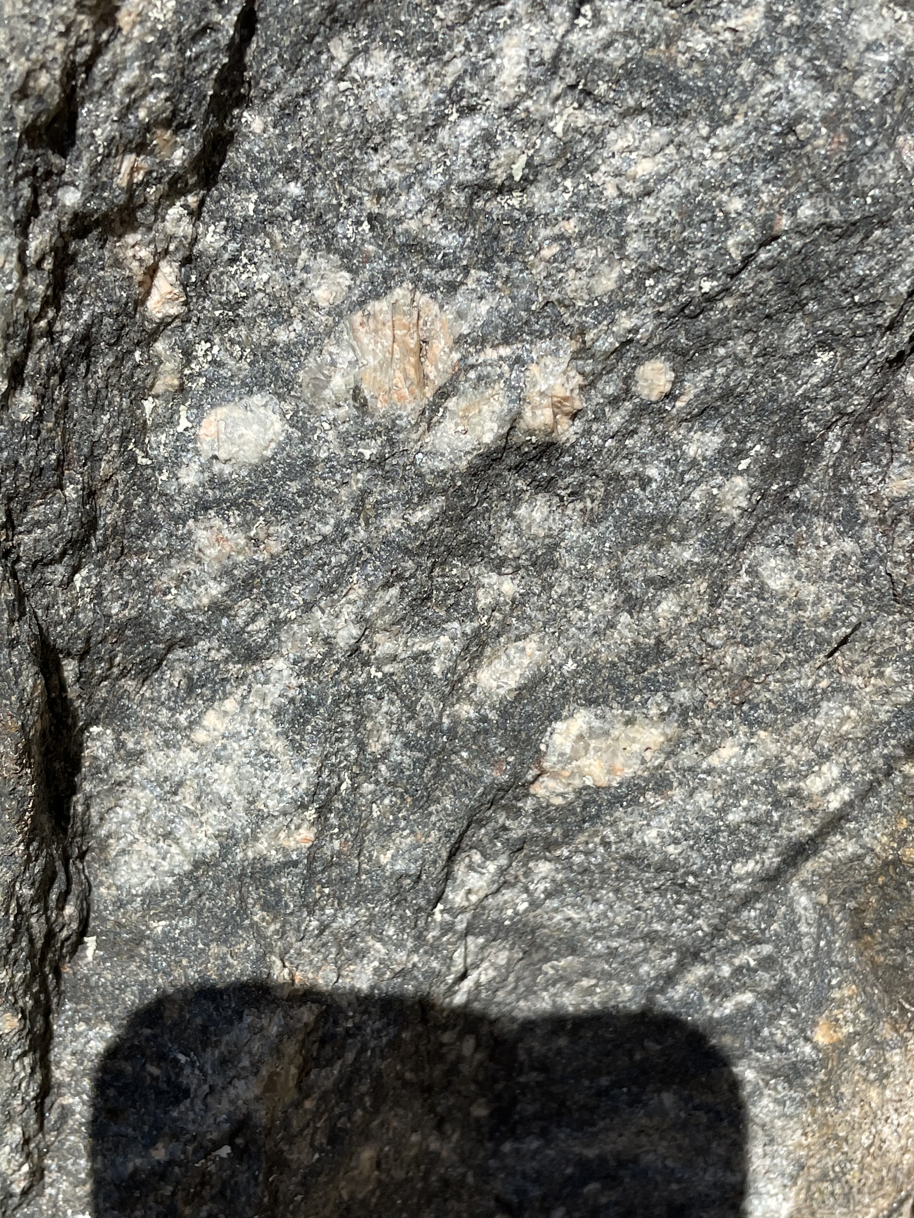 Viewed up close, this rock consists of quartz and alkali feldspars (i.e. albite and orthoclase), with minor biotite (Fig. 8).