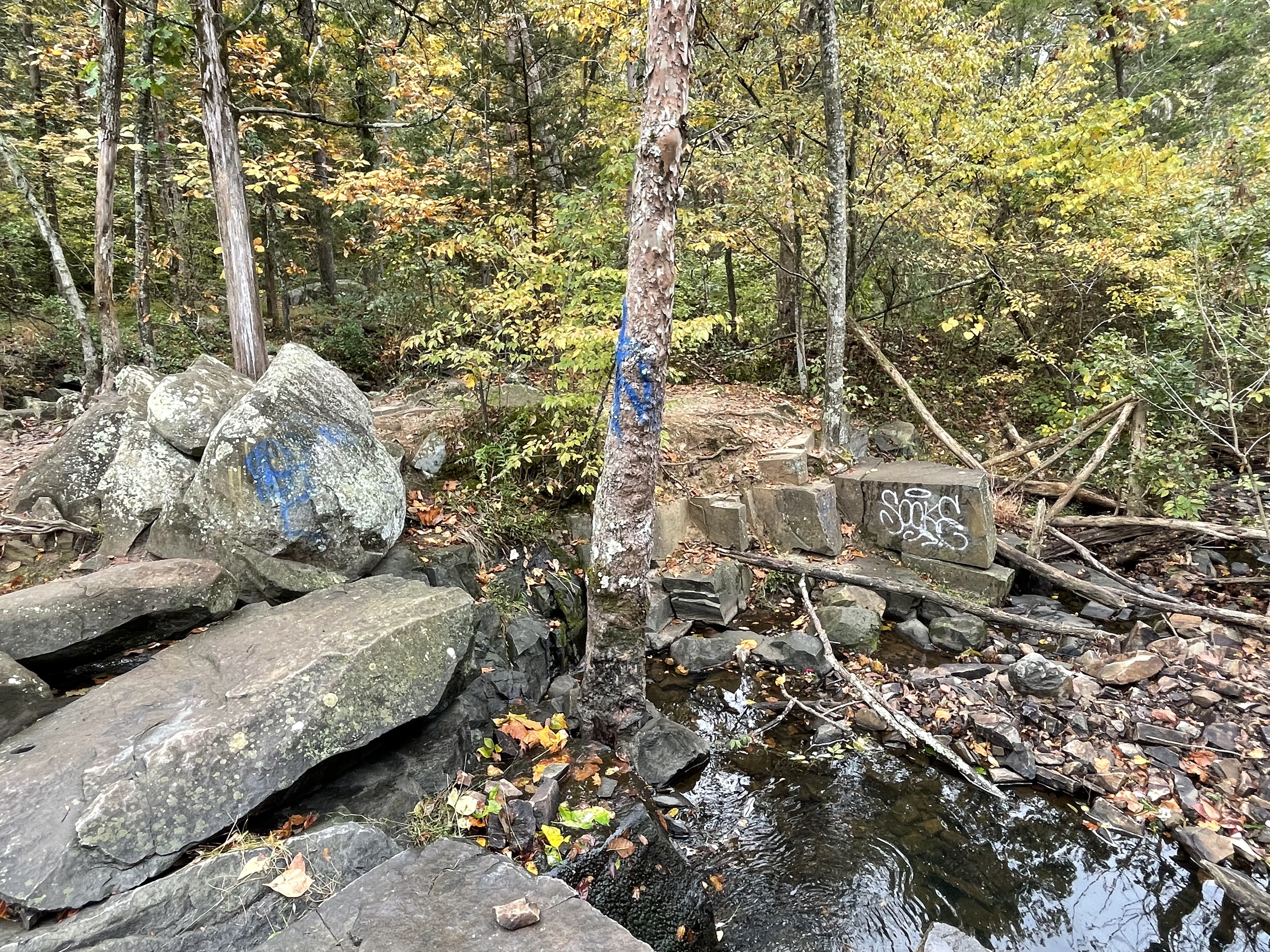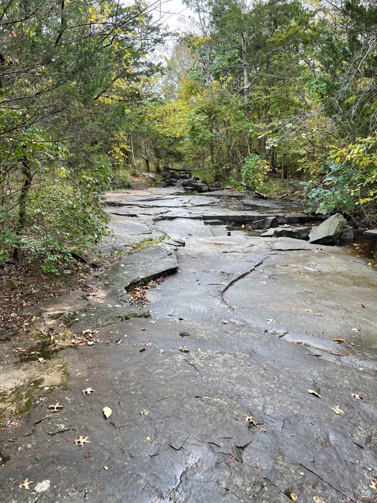 This boulder field, littering a dry fork of Frying Pan Branch, suggests that the smooth flow over the upstream reach shown in Fig. 3 is capable of transporting large rocks; however, it’s all relative from a geological perspective. If I were to guess, I’d say that the boulders in Fig. 8 haven’t moved in several thousand years. My reasoning is that the clear path seen in Fig. 3 suggests that there are no more large stones to roll downhill and dislodge others, like dominoes. But we never know what comes next.