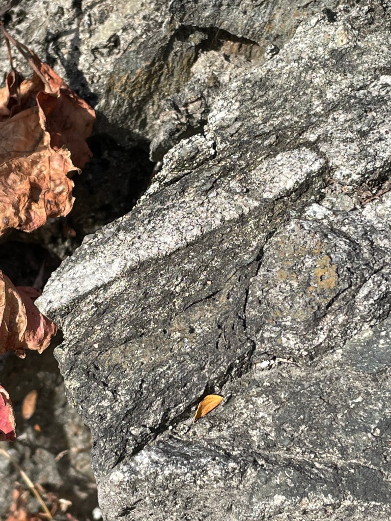 The green area in the inset map of Fig. 1 has been classified as the Sykesville Formation. These are sedimentary rocks, formed from a melange that collected behind an island arc. They contain a crazy mixture of sediments eroded from volcanic islands and exhumed rocks when these islands were smeared onto a continent at geological time scales (e.g. Japan and the Philippines today). This is a very slow process. However, this entire episode was nothing more than the prelude to closing of the Iapetus Ocean when two continental land masses collided, neither of which could be subducted beneath the other. Thus, these marine sediments were buried and subjected to incredible pressure and heat, producing the metasedimentary rocks of the Sykesville Formation.
