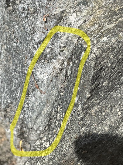 The original sedimentary texture (layers of sediments deposited horizontally) has been overprinted by foliation, a metamorphic texture caused by compression deep beneath the surface, usually at high temperature. The nearly vertical, yellow line in Fig. 2 indicates this metamorphic foliation, which is probably close to the orientation of original bedding. The circled areas show striations on a foliation surface (lower right) and perpendicular (upper left).