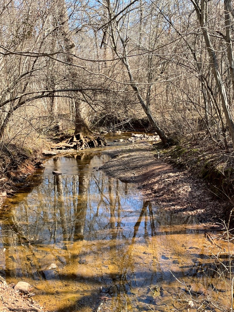 Horsepen Run (aka creek) drops quickly from the Pleistocene terrace (Fig. 1) but then crosses the Potomac flood plain and begins to meander. The photo in Fig. 3 is from a location just before this change in stream topography occurred.