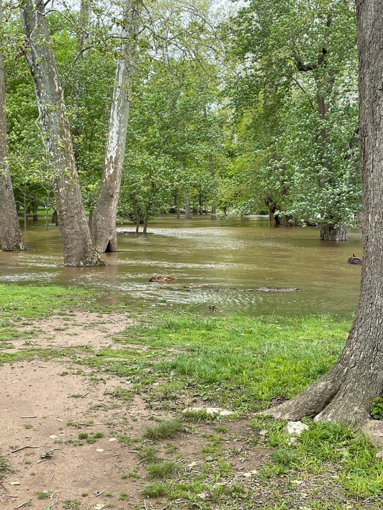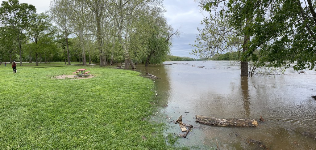 The water level is several feet higher than on our last visit, and is expected to crest in two days. Unfortunately, I won’t be here to document that event, but I expect the water to be covering the picnic table placed on the active floodplain in Fig. 1. Low areas were inundated (Fig. 2).