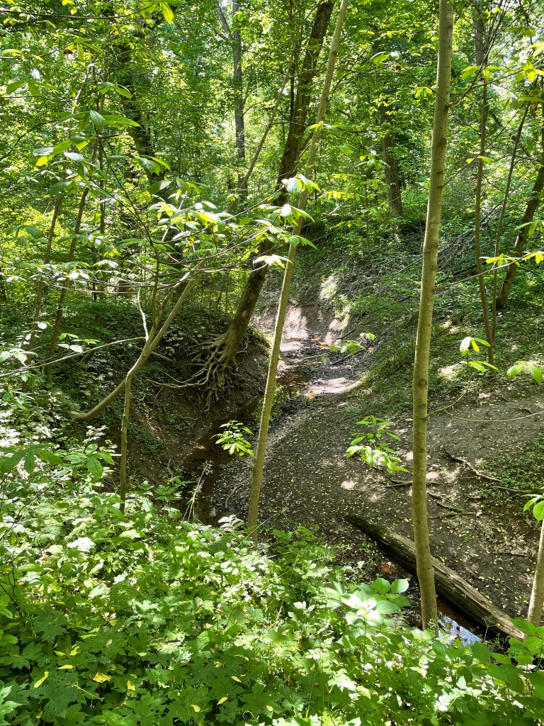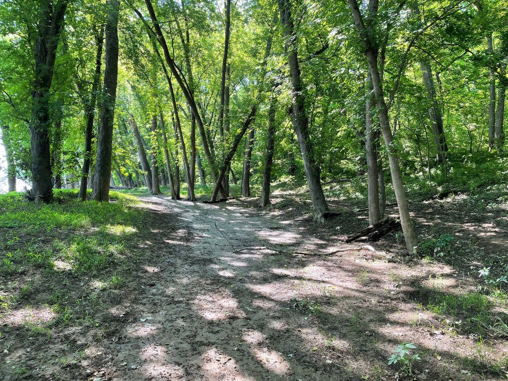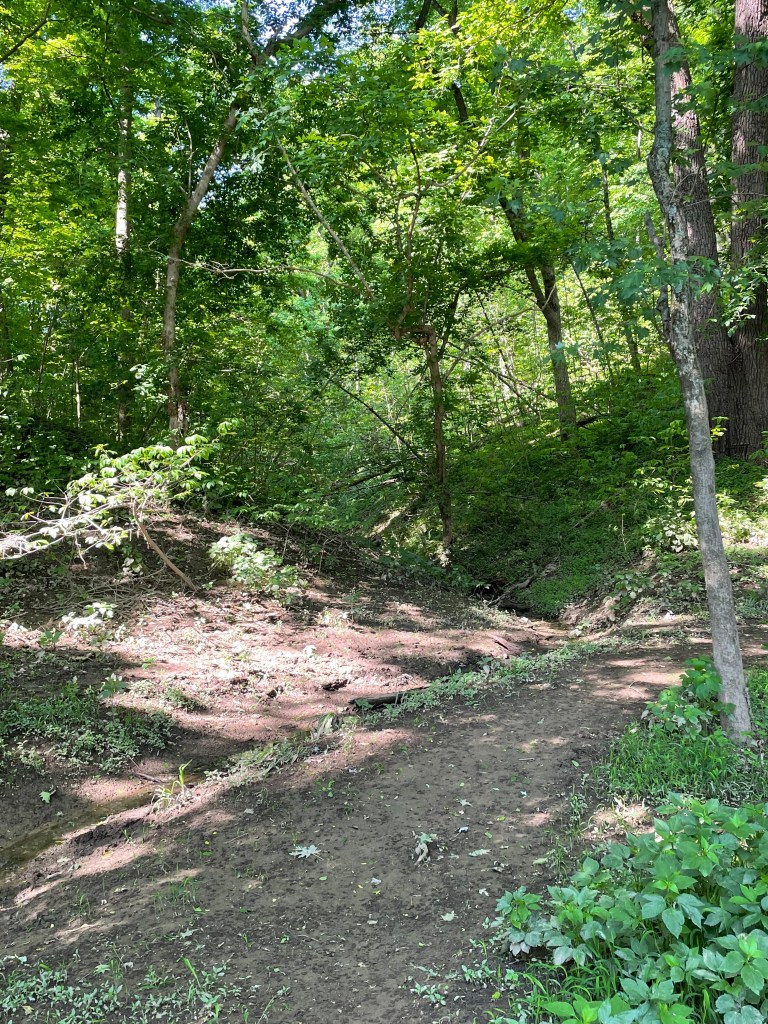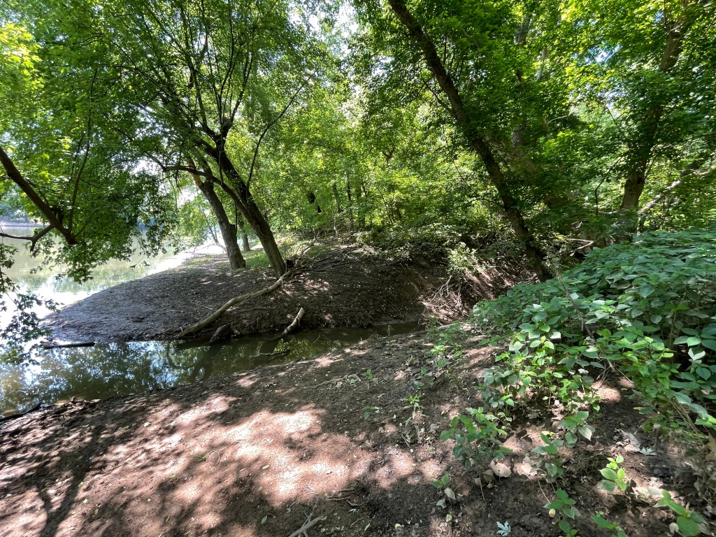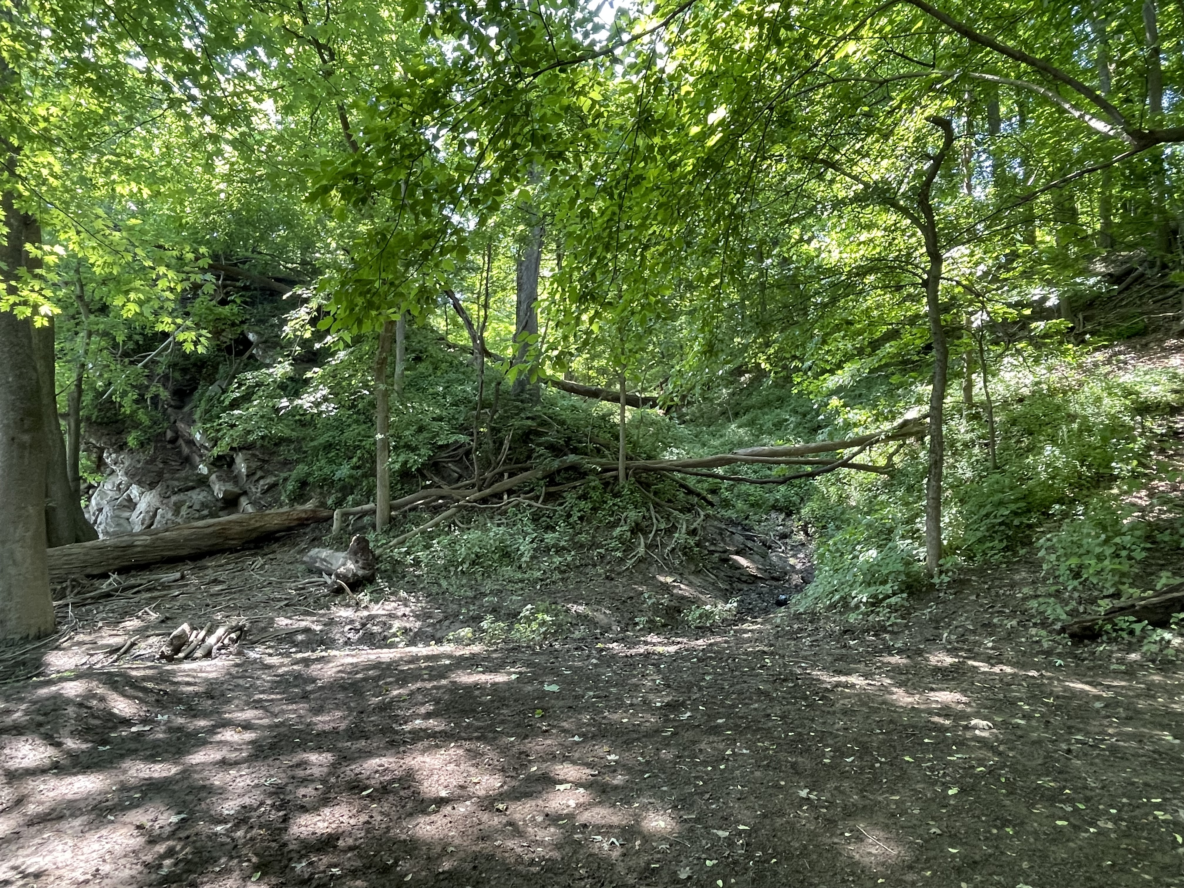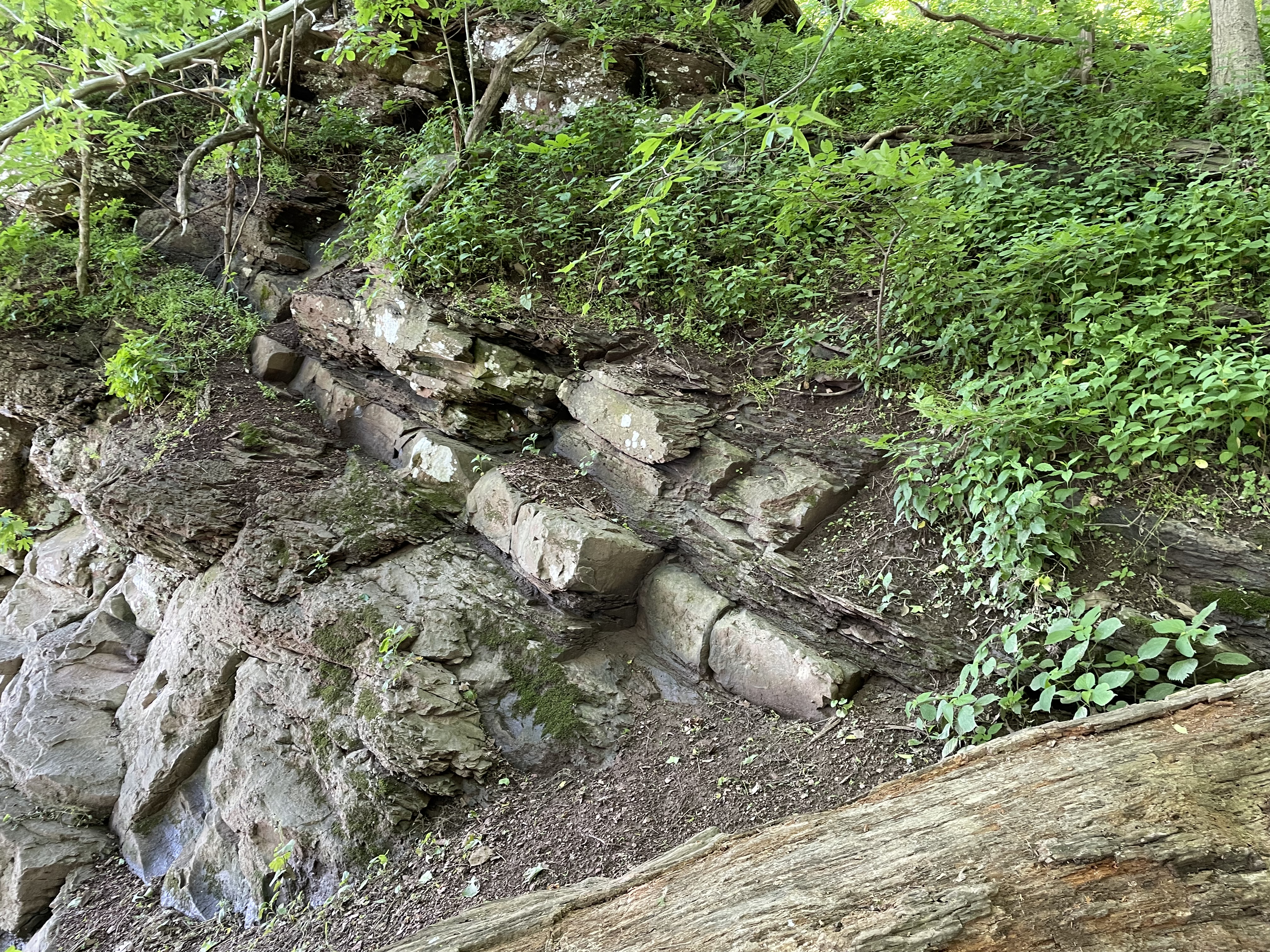 A little further upstream (see Fig. 2 for location) is the probable type-locale of the Balls Bluff siltstone, but good exposures weren’t accessible because the bluff is higher and the bank narrower, there being no floodplain as we saw elsewhere (Fig. 7). In fact, the only rocks we saw were at the top of Balls Bluff (Fig. 10) and along a trail that led to the river, where I was able to estimate strike and dip.