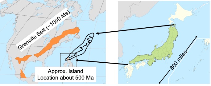 Here’s a schematic cross-section of the most-likely geography during the Taconic orogeny (Fig. 2). Imagine Honshu as the island arc shown offshore of the ancient North American continent (to the left in the cartoons).