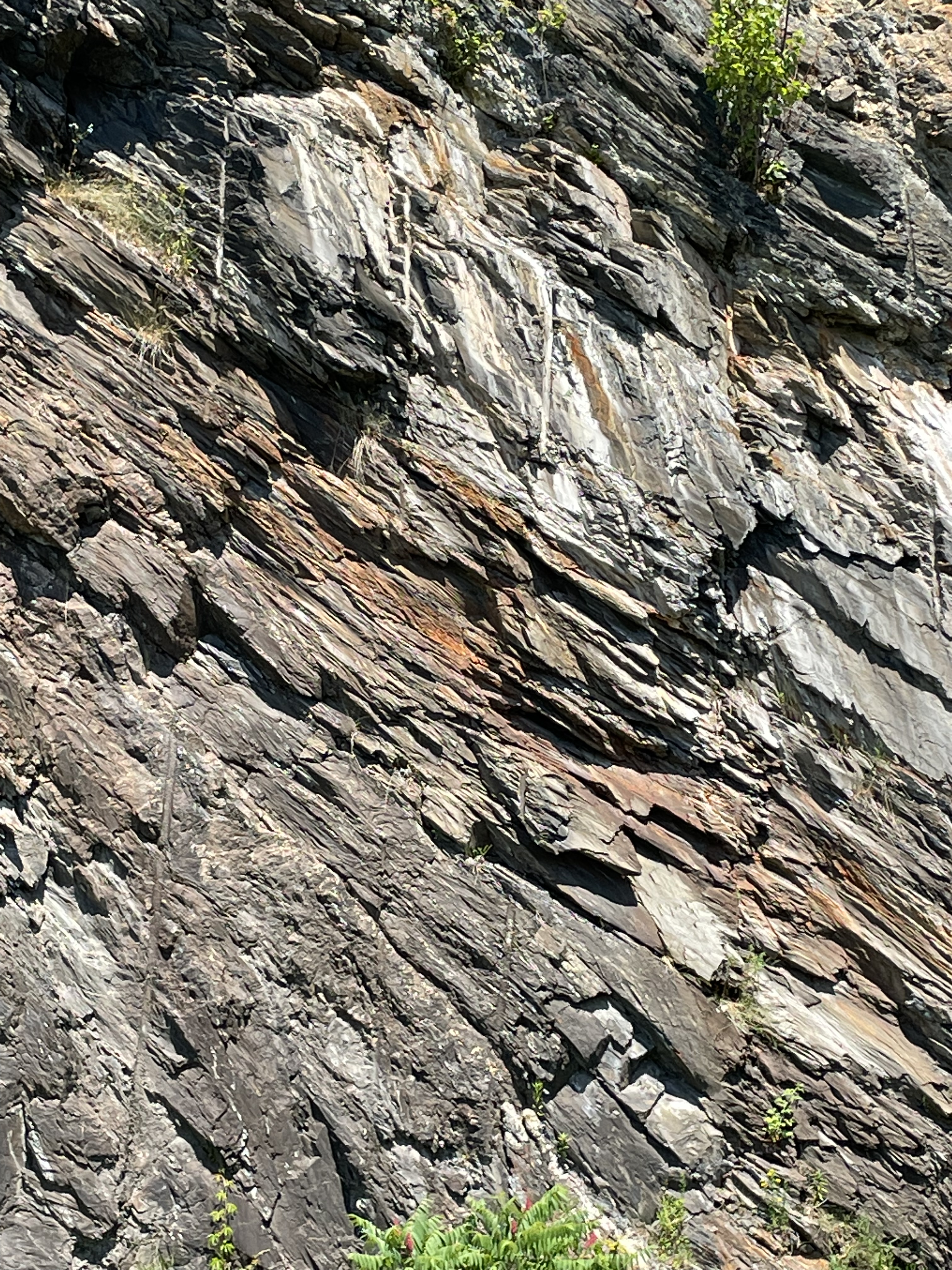 These are the mountains for which the Taconic Orogeny (550-440 Ma) was named. They were deposited as long ago as a billion years in a shallow sea (e.g. Sea of Japan) and then buried, before being compressed and heated, finally being pushed onto the porto-north America continent by 440 Ma. During this long period of metamorphism, the clay minerals comprising the bulk of the sediments recrystallized into mica (mostly muscovite), a platy mineral that creates both a sheen and a fissile texture, the tendency to flake apart (Fig. 2).