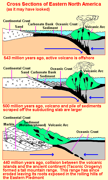 Modern Honshu and the Sea of Japan are most representative of the Taconic orogeny earlier than 543 my, before subduction began on the western margin in the top panel. There is no subduction in the Sea of Japan today; in fact, spreading stopped about 20 million-years ago; details are hard to find because there are no easily accessible seismic sections of the Sea of Japan. Thus, to apply the cartoon from Fig. 2, ignore the subducting back-arc ocean crust (black layers) and focus on the deformed gray areas in the middle panel.