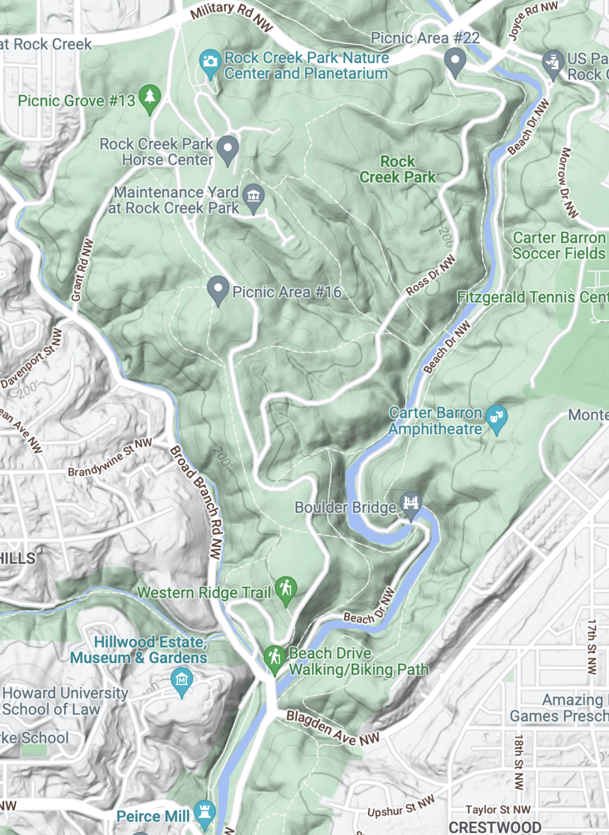 Rock Creek National Park deserves its name, not just because of its rock bed. Cambrian sedimentary rocks exposure along the steep tributaries leading to the creek (river?) suggest that bedrock lies not very far beneath our feet (Fig. 5).