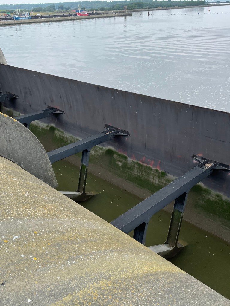 Figure 3. Detail of gate on river side. The gates were closed when we visited at low tide, possibly to keep water depths navigable in the estuary.