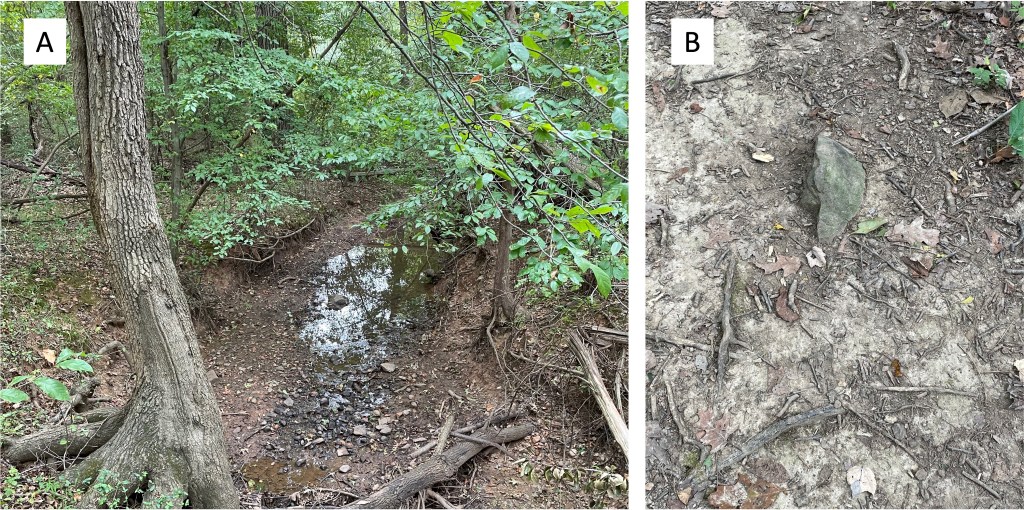 This interpretation is speculative because bed rock is never far beneath the surface in northern Virginia. We saw no outcrops on the ridge, however, which doesn’t mean that there is no resistant rock beneath the gravel-covered slopes, but it is consistent (geologists love that word) with my interpretation. Further support for the ancient stream-bed hypothesis comes from the orientation of the ridge, which doesn’t follow the regional structural trend of NE-SW for basement rocks. Note that the Appalachian Mountains define this trend (see Fig. 1), as have all of the Paleozoic and Mesozoic rocks we have encountered in the area. The uplands (see Fig. 1) ridge is oriented east-to-west, which goes against the grain, geologically speaking.