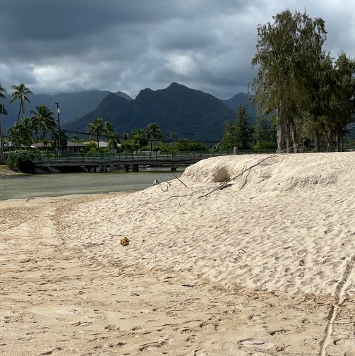 Figure 2. View looking inland at Kailua beach. The stream that passes through the break in the sand dune is typical for Oahu, in that it doesn’t reach the sea during the dry season. Note the erosional scarp at the top of the sand dune, which may be a seasonal feature that is healed during the rainy and stormy season. If I had to guess, however, I’d say it is a long-term feature.
