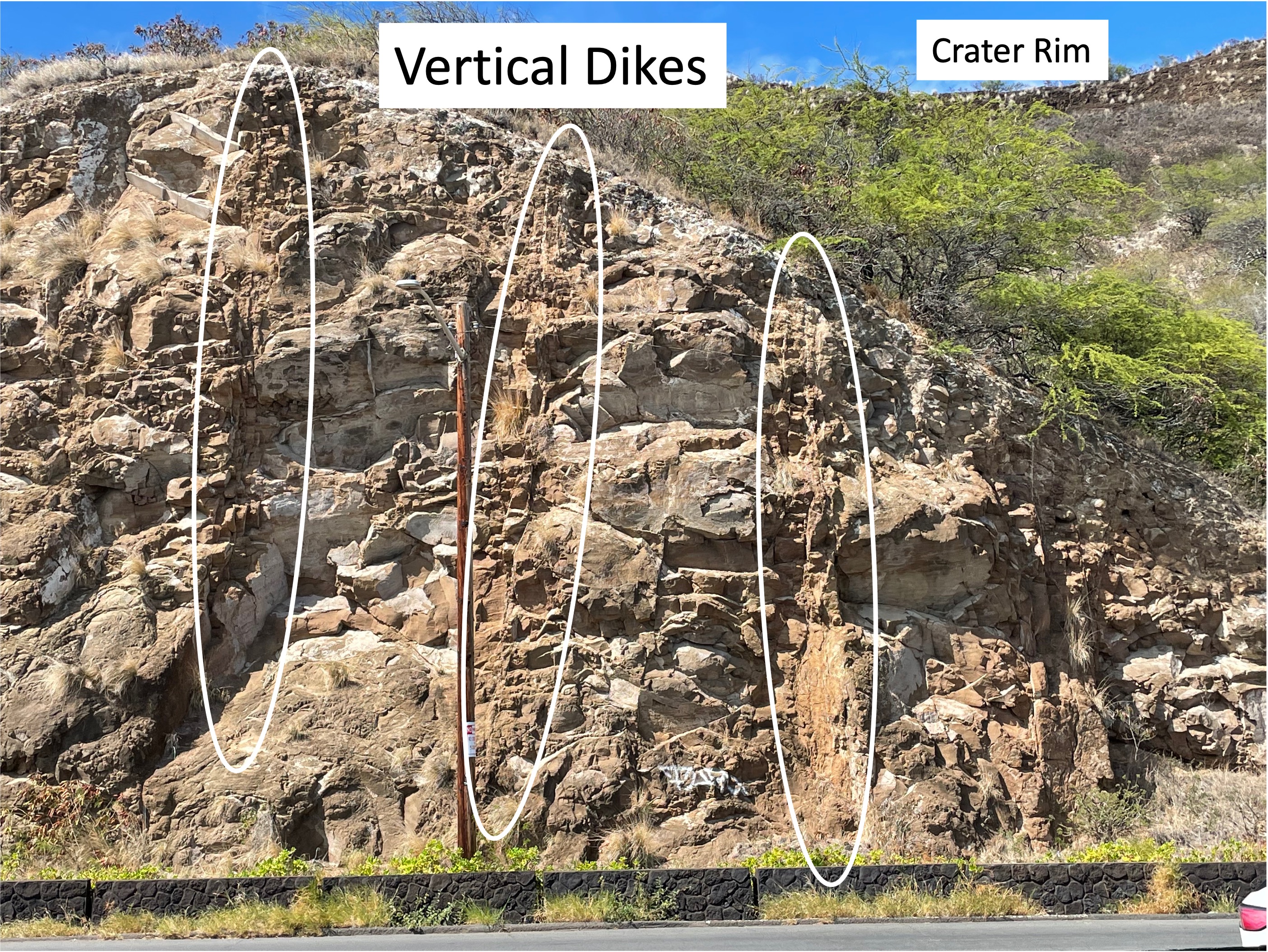 Another surprising feature I saw along the seaward margin of the Diamond Head tuff cone was a set of vertical joints filled with reddish rock (Fig. 4).
