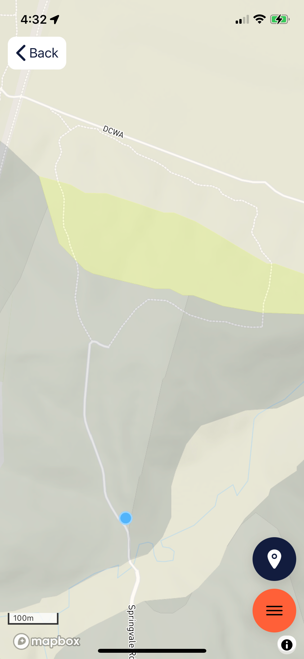 FIGURE 2. The blue dot marks the gravel road that leads to the trail we took, which is indicated by the dashed line. The light-green area to the left is the schist (1000-511 Ma) we’ve seen along this stretch of the Potomac. The darker area to its right is a metagraywacke from the same era. These rocks were originally deposited in an ocean trench where ocean crust was being subducted beneath continental crust. They were buried along with the ocean crust and deformed into medium-grade metamorphic rocks.