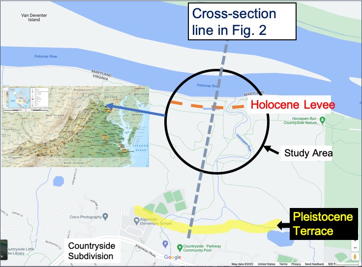 I wrote a post about streams traversing the Potomac River flood plain in a previous post. Horsepen Run is a meandering stream that has cut down several feet across the gently undulating sediments blanketing the mile-wide flood plain at this point on the Potomac (Fig. 1).