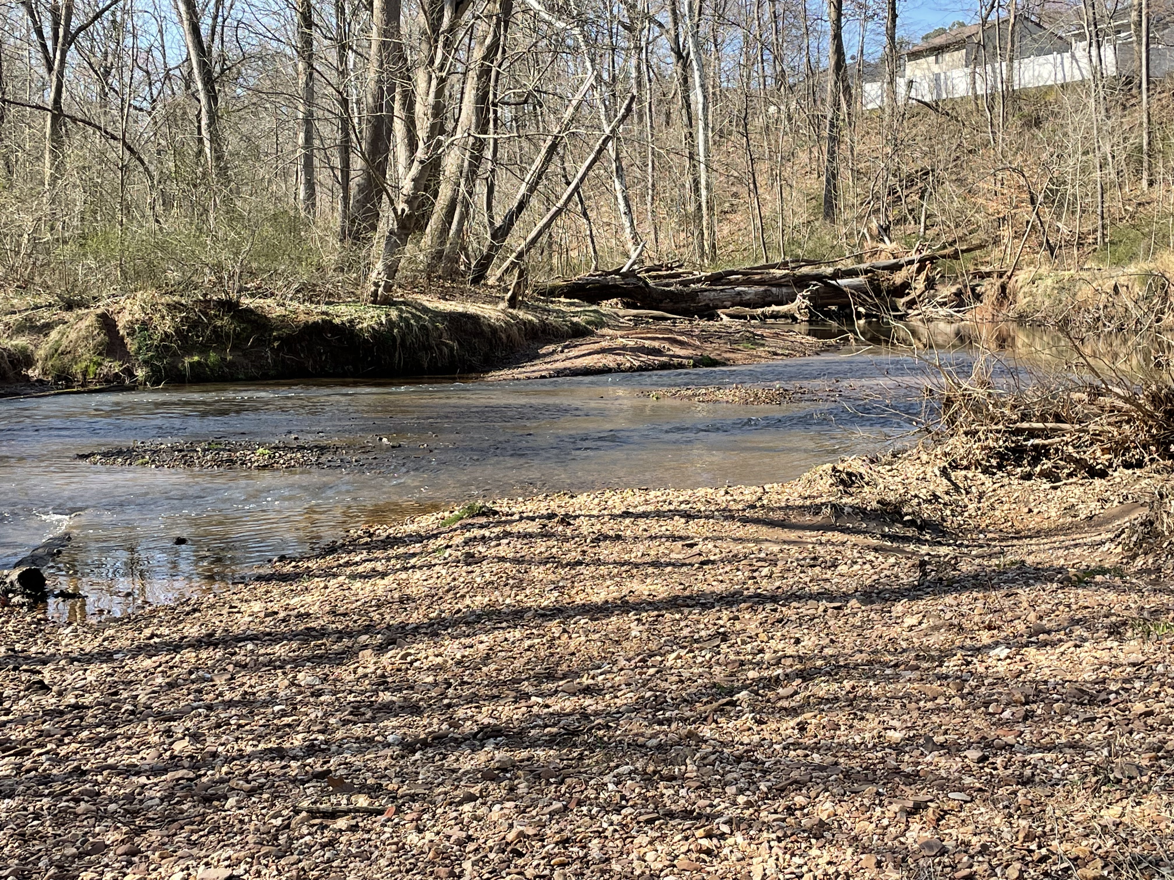 Because of the obstruction seen in the previous photo, flow and sediment delivery downstream is reduced temporarily (until the tree rots and collapses). The creek bed is exposed, showing multiple channels that predate the obstruction. Creeks never follow a single channel like a canal. Sugarland Run is a braided creek at this locality. This morphology is dynamic because of high sediment load and can change rapidly, unlike a more stable anastomosing river. The Potomac is an example of the latter. Of course, a river can change character in different sections of its channel, which we’ll see in my next post.